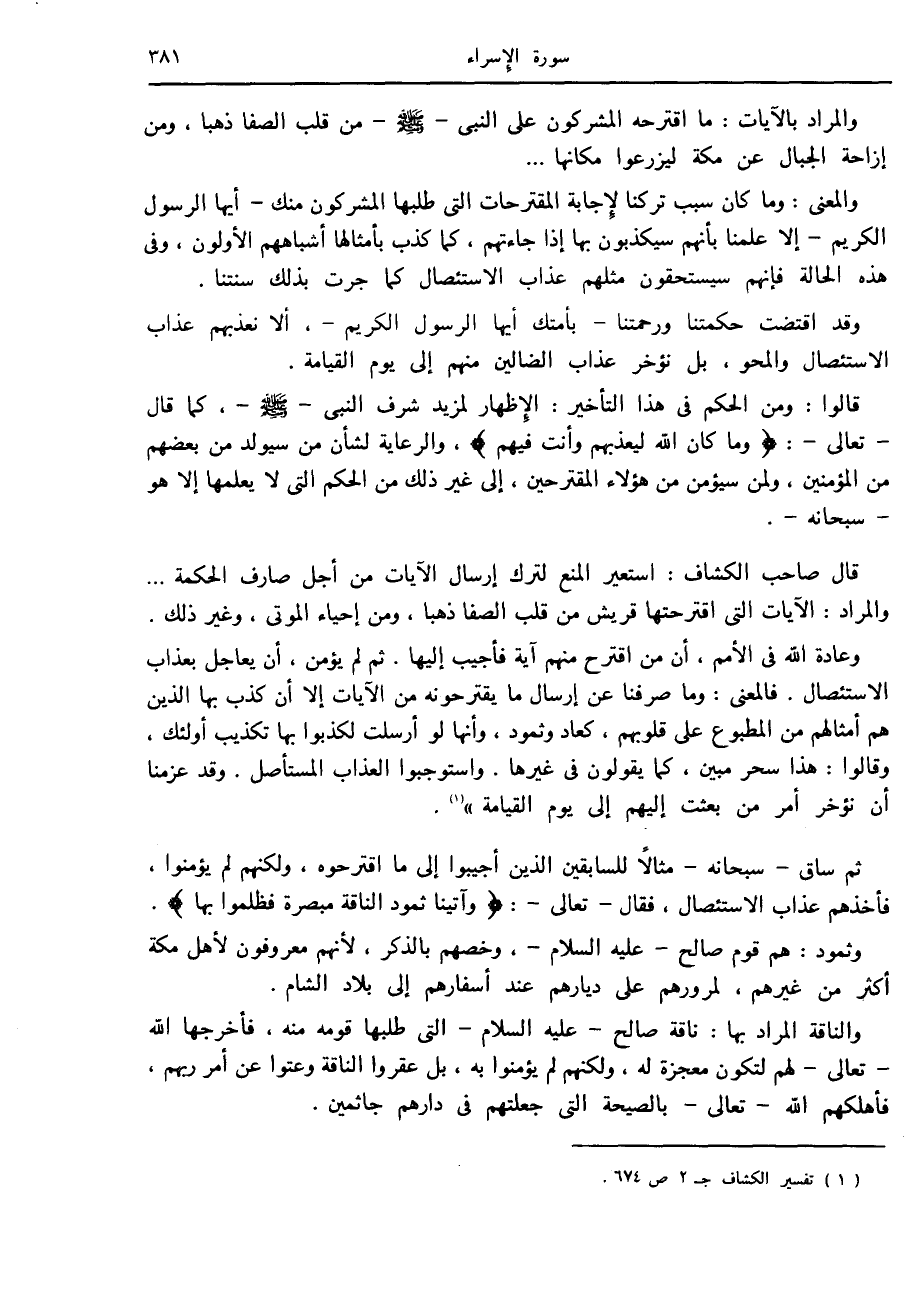 ثم ساق- سبحانه- مثالا للسابقين الذين أجيبوا إلى ما اقترحوه، ولكنهم لم يؤمنوا، فأخذهم عذاب الاستئصال، فقال- تعالى-: وَآتَيْنا ثَمُودَ النَّاقَةَ مُبْصِرَةً فَظَلَمُوا بِها.