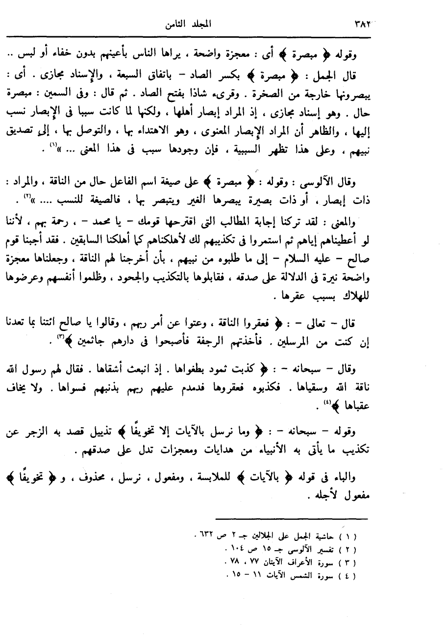 يبصرونها خارجة من الصخرة. وقرئ شاذا بفتح الصاد. ثم قال: وفي السمين: مبصرة حال. وهو إسناد مجازى، إذ المراد إبصار أهلها، ولكنها لما كانت سببا في الإبصار نسب إليها، والظاهر أن المراد الإبصار المعنوي، وهو الاهتداء بها، والتوصل بها، إلى تصديق نبيهم، وعلى هذا تظهر السببية، فإن وجودها سبب في هذا المعنى ... » «1» .