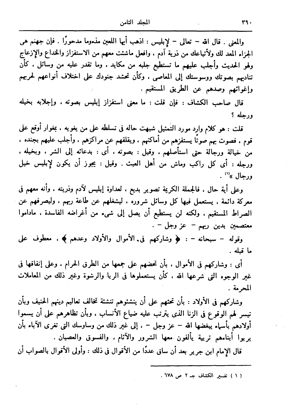 وشاركهم في الأولاد: بأن تحثهم على أن ينشئوهم تنشئة تخالف تعاليم دينهم الحنيف وبأن تيسر لهم الوقوع في الزنا الذي يترتب عليه ضياع الأنساب، وبأن تظاهرهم على أن يسموا أولادهم بأسماء يبغضها الله- عز وجل-، إلى غير ذلك من وساوسك التي تغرى الآباء بأن يربوا أبناءهم تربية يألفون معها الشرور والآثام، والفسوق والعصيان.