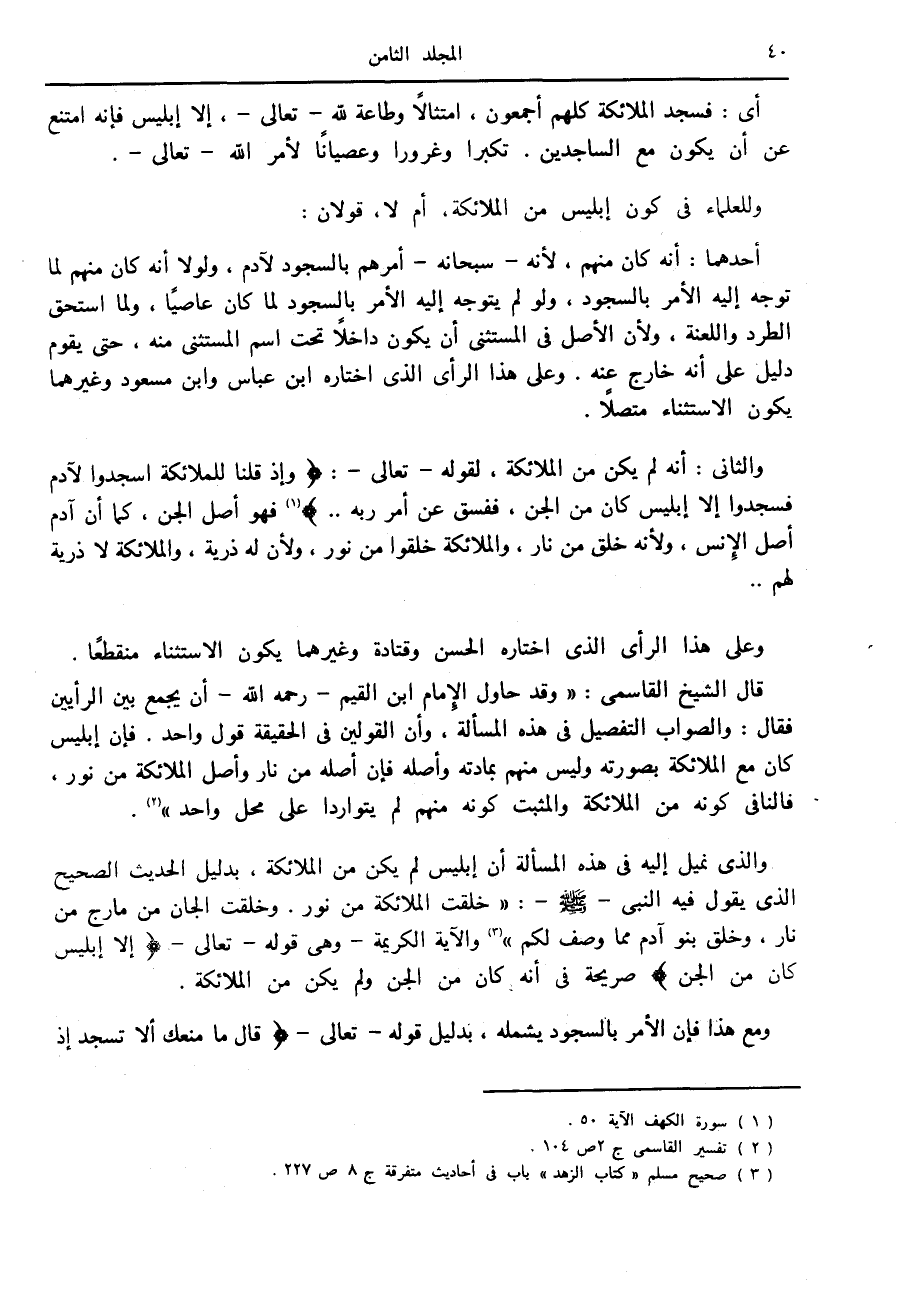 والذي نميل إليه في هذه المسألة أن إبليس لم يكن من الملائكة، بدليل الحديث الصحيح الذي يقول فيه النبي صلى الله عليه وسلم: «خلقت الملائكة من نور. وخلقت الجان من مارج من نار، وخلق بنو آدم مما وصف لكم» «3» والآية الكريمة- وهي قوله- تعالى- إِلَّا إِبْلِيسَ كانَ مِنَ الْجِنِّ صريحة في أنه كان من الجن ولم يكن من الملائكة.