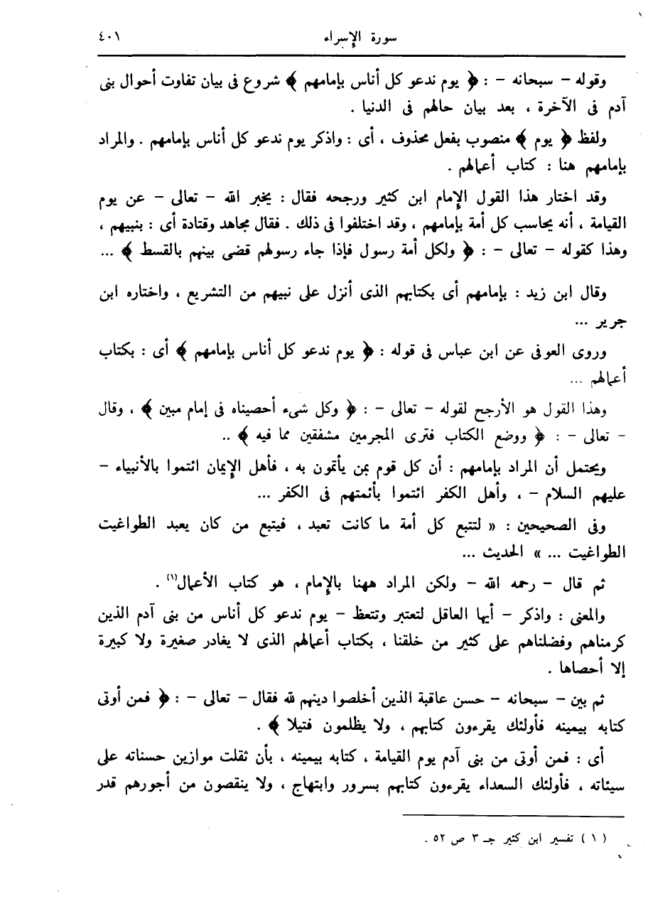 وروى العوفى عن ابن عباس في قوله: يَوْمَ نَدْعُوا كُلَّ أُناسٍ بِإِمامِهِمْ أى: بكتاب أعمالهم ...