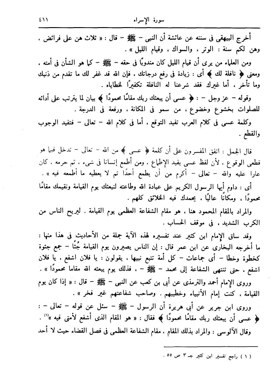 وقوله- عز وجل-: عَسى أَنْ يَبْعَثَكَ رَبُّكَ مَقاماً مَحْمُوداً بيان لما يترتب على أدائه للصلوات بخشوع وخضوع، من سمو في المكانة، ورفعة في الدرجة.