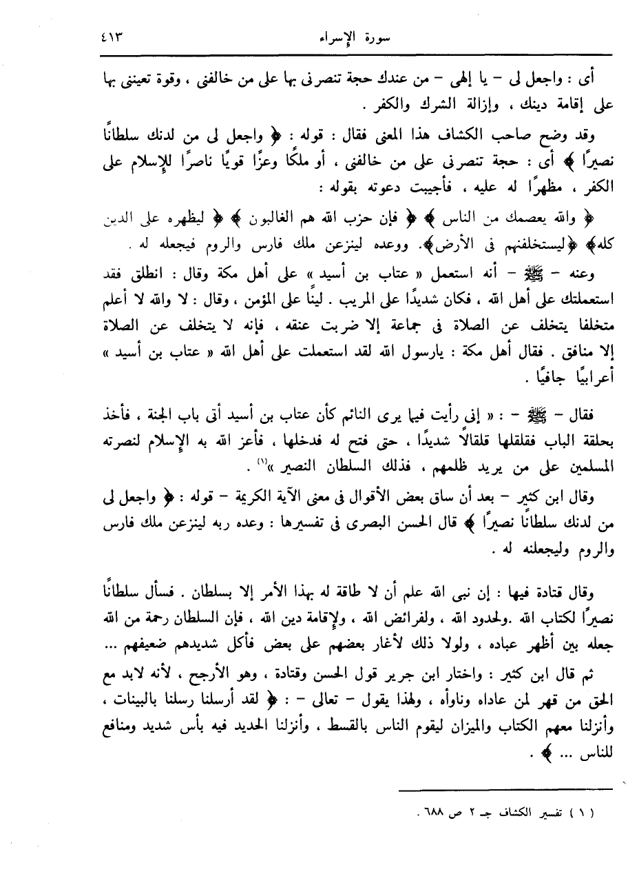 وقال ابن كثير- بعد أن ساق بعض الأقوال في معنى الآية الكريمة- قوله: وَاجْعَلْ لِي مِنْ لَدُنْكَ سُلْطاناً نَصِيراً قال الحسن البصري في تفسيرها: وعده ربه لينزعن ملك فارس والروم وليجعلنه له.