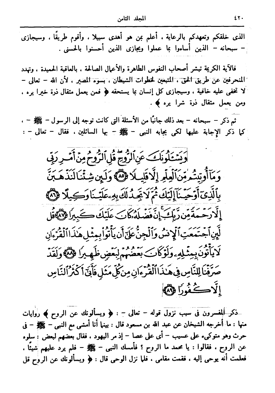 وَيَسْئَلُونَكَ عَنِ الرُّوحِ قُلِ الرُّوحُ مِنْ أَمْرِ رَبِّي وَما أُوتِيتُمْ مِنَ الْعِلْمِ إِلاَّ قَلِيلاً (85) وَلَئِنْ شِئْنا لَنَذْهَبَنَّ بِالَّذِي أَوْحَيْنا إِلَيْكَ ثُمَّ لا تَجِدُ لَكَ بِهِ عَلَيْنا وَكِيلاً (86) إِلاَّ رَحْمَةً مِنْ رَبِّكَ إِنَّ فَضْلَهُ كانَ عَلَيْكَ كَبِيراً (87) قُلْ لَئِنِ اجْتَمَعَتِ الْإِنْسُ وَالْجِنُّ عَلى أَنْ يَأْتُوا بِمِثْلِ هذَا الْقُرْآنِ لا يَأْتُونَ بِمِثْلِهِ وَلَوْ كانَ بَعْضُهُمْ لِبَعْضٍ ظَهِيراً (88) وَلَقَدْ صَرَّفْنا لِلنَّاسِ فِي هذَا الْقُرْآنِ مِنْ كُلِّ مَثَلٍ فَأَبى أَكْثَرُ النَّاسِ إِلاَّ كُفُوراً (89)