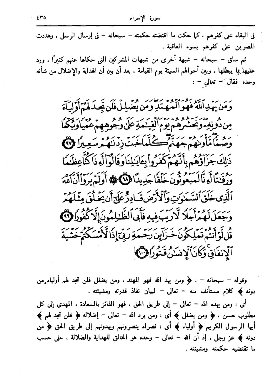 وَمَنْ يَهْدِ اللَّهُ فَهُوَ الْمُهْتَدِ وَمَنْ يُضْلِلْ فَلَنْ تَجِدَ لَهُمْ أَوْلِياءَ مِنْ دُونِهِ وَنَحْشُرُهُمْ يَوْمَ الْقِيامَةِ عَلى وُجُوهِهِمْ عُمْياً وَبُكْماً وَصُمًّا مَأْواهُمْ جَهَنَّمُ كُلَّما خَبَتْ زِدْناهُمْ سَعِيراً (97) ذلِكَ جَزاؤُهُمْ بِأَنَّهُمْ كَفَرُوا بِآياتِنا وَقالُوا أَإِذا كُنَّا عِظاماً وَرُفاتاً أَإِنَّا لَمَبْعُوثُونَ خَلْقاً جَدِيداً (98) أَوَلَمْ يَرَوْا أَنَّ اللَّهَ الَّذِي خَلَقَ السَّماواتِ وَالْأَرْضَ قادِرٌ عَلى أَنْ يَخْلُقَ مِثْلَهُمْ وَجَعَلَ لَهُمْ أَجَلاً لا رَيْبَ فِيهِ فَأَبَى الظَّالِمُونَ إِلاَّ كُفُوراً (99) قُلْ لَوْ أَنْتُمْ تَمْلِكُونَ خَزائِنَ رَحْمَةِ رَبِّي إِذاً لَأَمْسَكْتُمْ خَشْيَةَ الْإِنْفاقِ وَكانَ الْإِنْسانُ قَتُوراً (100)