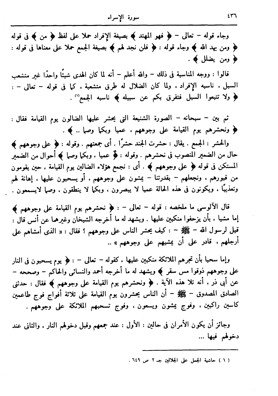 قال الآلوسى ما ملخصه: قوله- تعالى-: نَحْشُرُهُمْ يَوْمَ الْقِيامَةِ عَلى وُجُوهِهِمْ إما مشيا، بأن يزحفوا منكبين عليها. ويشهد له ما أخرجه الشيخان وغيرهما عن أنس قال: