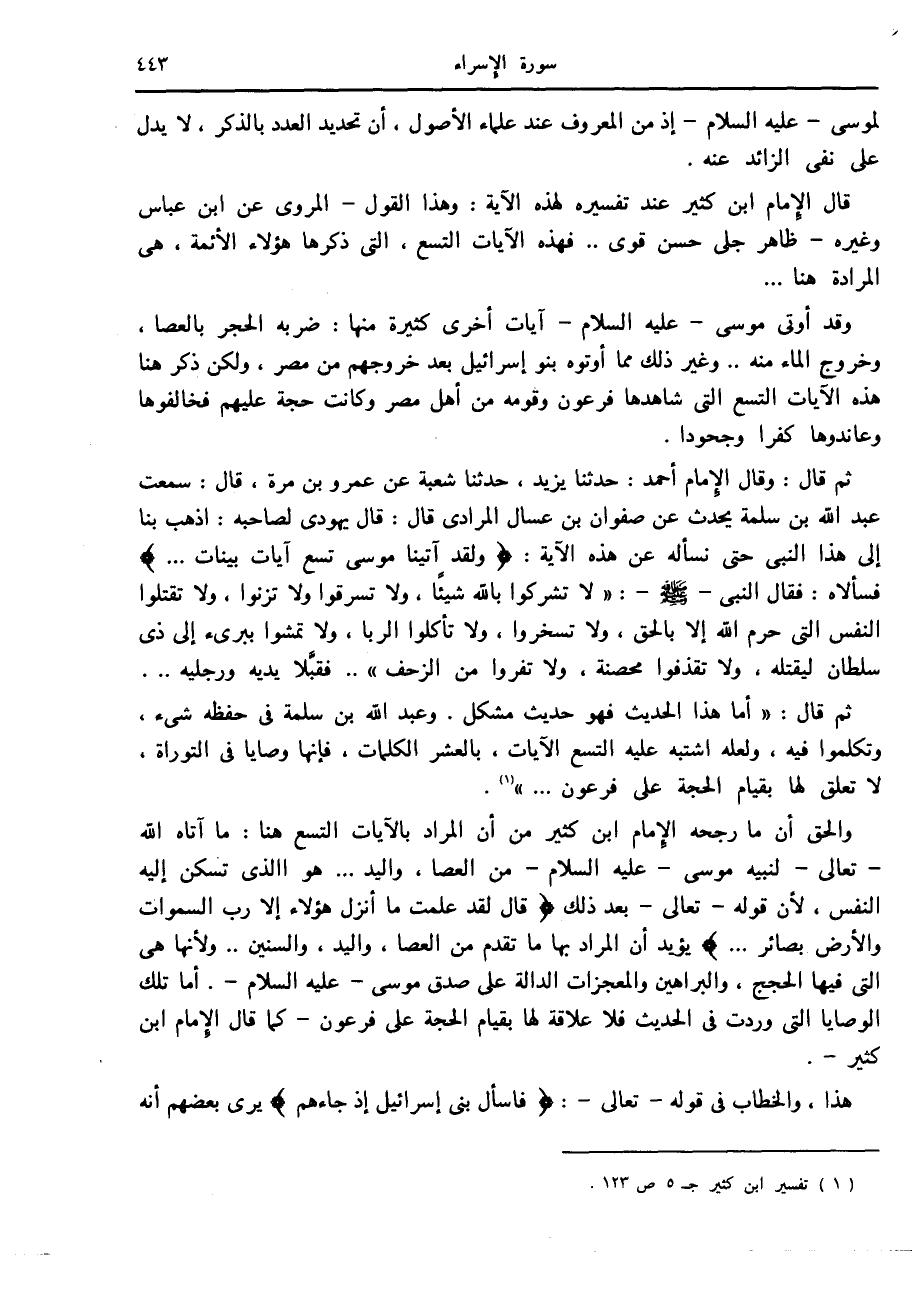 قال الإمام ابن كثير عند تفسيره لهذه الآية: وهذا القول- المروي عن ابن عباس وغيره- ظاهر جلى حسن قوى.. فهذه الآيات التسع، التي ذكرها هؤلاء الأئمة، هي المرادة هنا ...