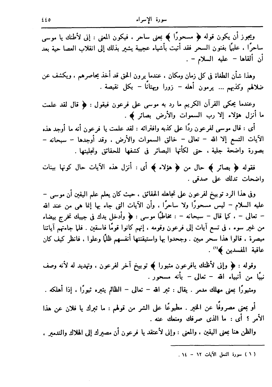 وفي هذا الرد توبيخ لفرعون على تجاهله الحقائق، حيث كان يعلم علم اليقين أن موسى- عليه السلام- ليس مسحورا ولا ساحرا، وأن الآيات التي جاء بها إنما هي من عند الله- تعالى-، كما قال- سبحانه-: مخاطبا موسى: وَأَدْخِلْ يَدَكَ فِي جَيْبِكَ تَخْرُجْ بَيْضاءَ مِنْ غَيْرِ سُوءٍ، فِي تِسْعِ آياتٍ إِلى فِرْعَوْنَ وَقَوْمِهِ، إِنَّهُمْ كانُوا قَوْماً فاسِقِينَ. فَلَمَّا جاءَتْهُمْ آياتُنا مُبْصِرَةً، قالُوا هذا سِحْرٌ مُبِينٌ. وَجَحَدُوا بِها وَاسْتَيْقَنَتْها أَنْفُسُهُمْ ظُلْماً وَعُلُوًّا، فَانْظُرْ كَيْفَ كانَ عاقِبَةُ الْمُفْسِدِينَ «1» .
