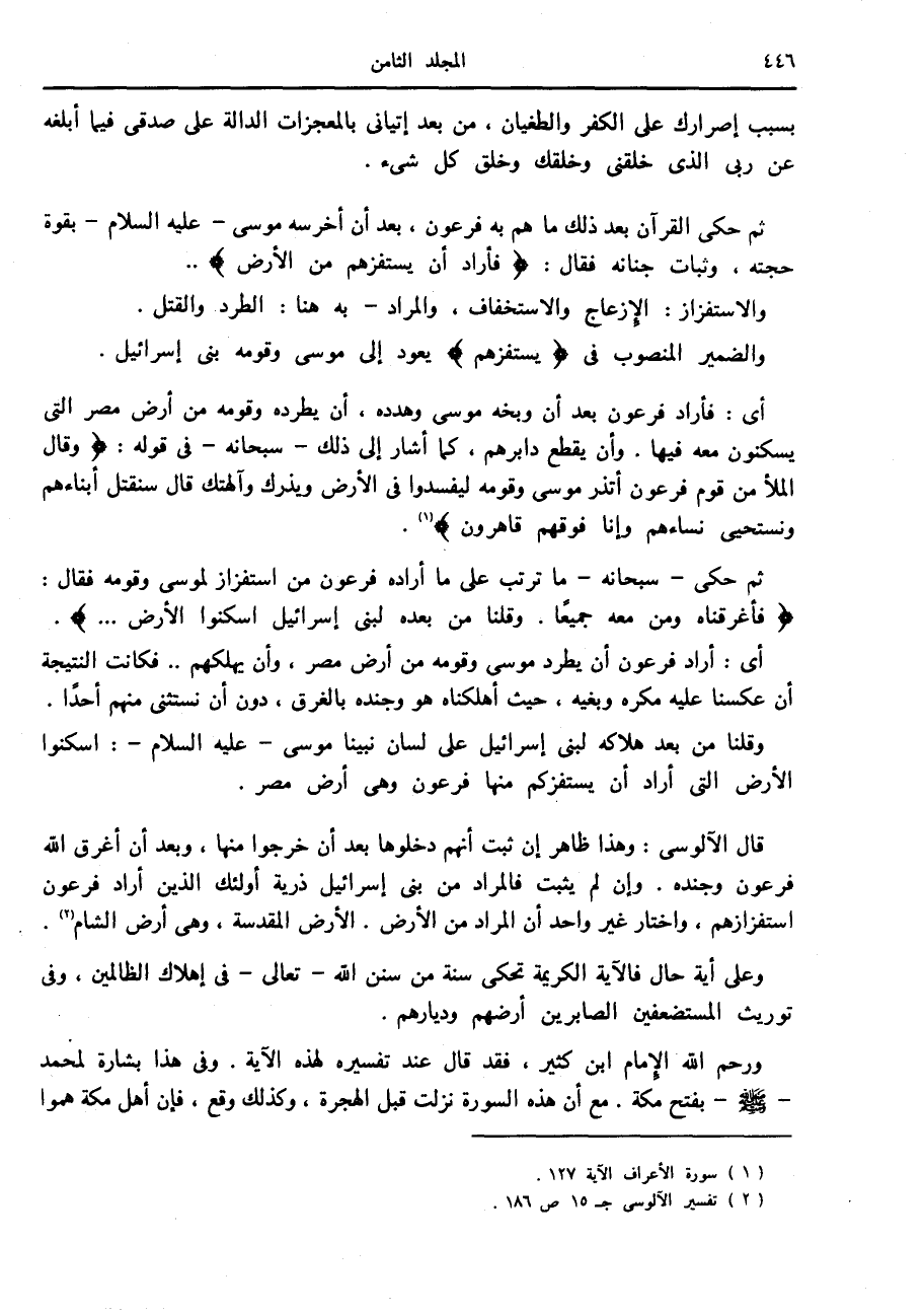 قال الآلوسى: وهذا ظاهر إن ثبت أنهم دخلوها بعد أن خرجوا منها، وبعد أن أغرق الله فرعون وجنده. وإن لم يثبت فالمراد من بنى إسرائيل ذرية أولئك الذين أراد فرعون استفزازهم، واختار غير واحد أن المراد من الأرض. الأرض المقدسة، وهي أرض الشام «2» .