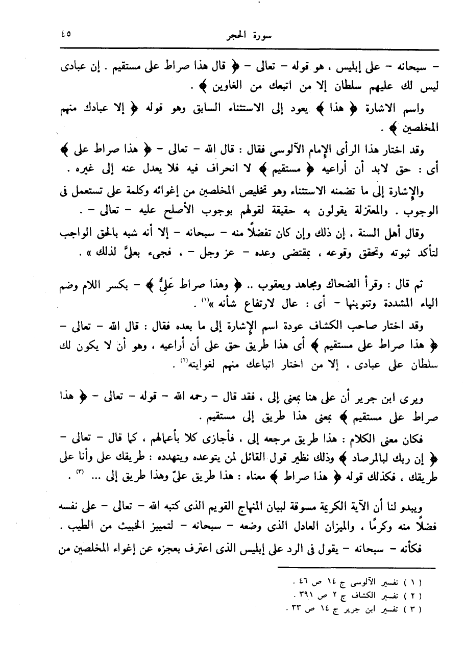 وقد اختار صاحب الكشاف عودة اسم الإشارة إلى ما بعده فقال: قال الله- تعالى- هذا صِراطٌ عَلَيَّ مُسْتَقِيمٌ أى هذا طريق حق على أن أراعيه، وهو أن لا يكون لك سلطان على عبادي، إلا من اختار اتباعك منهم لغوايته «2» .