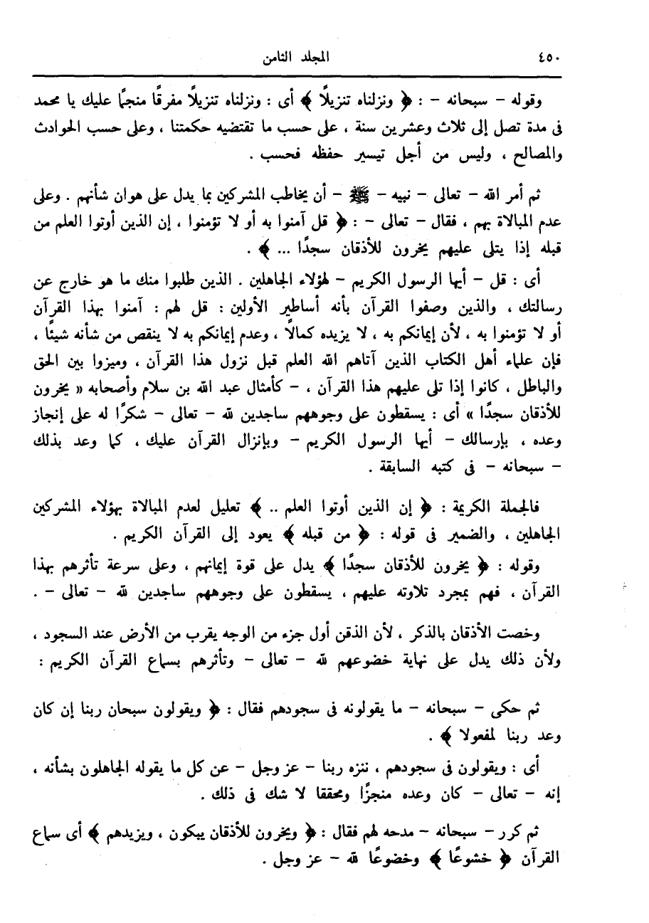 وخصت الأذقان بالذكر، لأن الذقن أول جزء من الوجه يقرب من الأرض عند السجود، ولأن ذلك يدل على نهاية خضوعهم لله- تعالى- وتأثرهم بسماع القرآن الكريم: