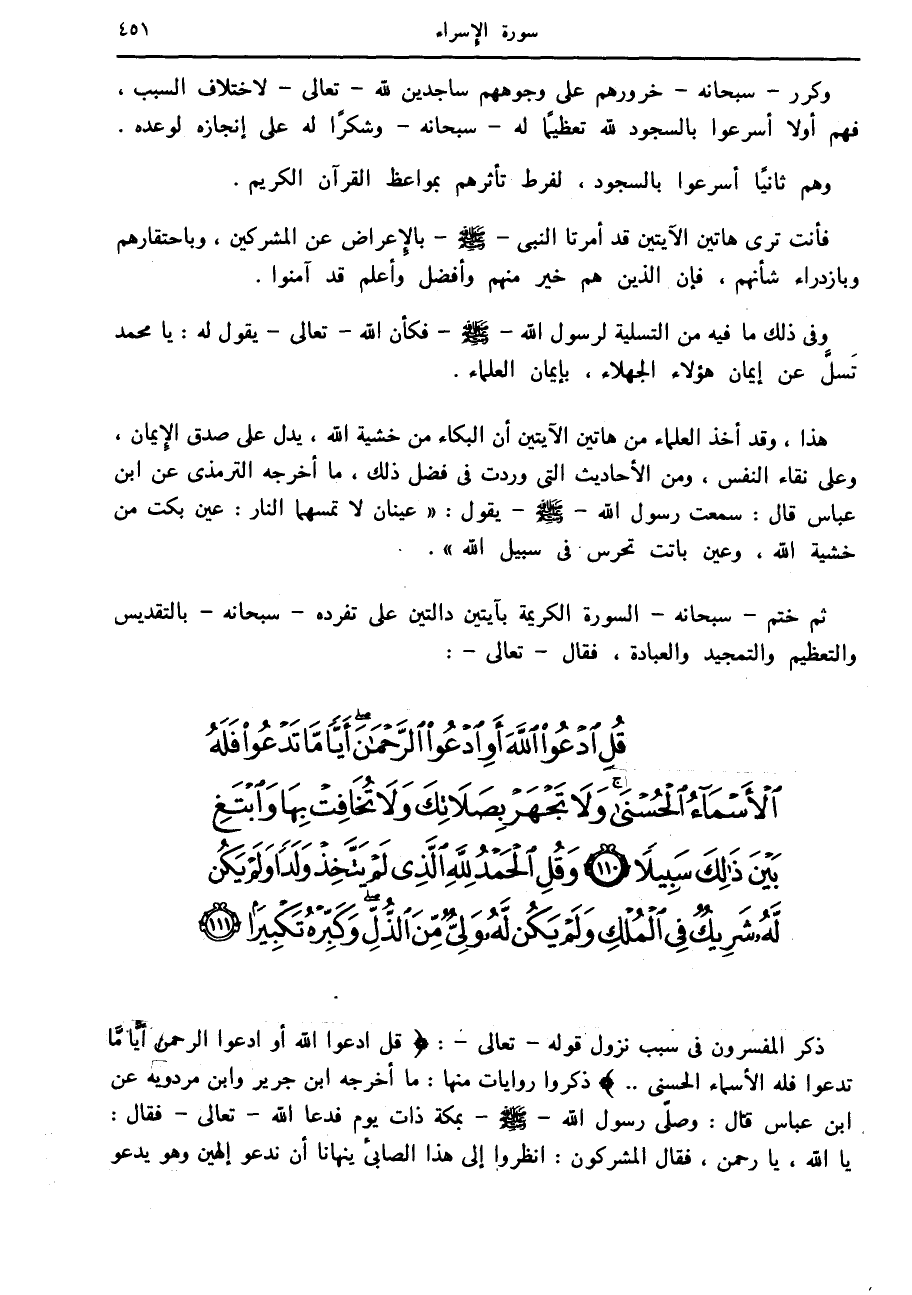 قُلِ ادْعُوا اللَّهَ أَوِ ادْعُوا الرَّحْمنَ أَيًّا ما تَدْعُوا فَلَهُ الْأَسْماءُ الْحُسْنى وَلا تَجْهَرْ بِصَلاتِكَ وَلا تُخافِتْ بِها وَابْتَغِ بَيْنَ ذلِكَ سَبِيلاً (110) وَقُلِ الْحَمْدُ لِلَّهِ الَّذِي لَمْ يَتَّخِذْ وَلَداً وَلَمْ يَكُنْ لَهُ شَرِيكٌ فِي الْمُلْكِ وَلَمْ يَكُنْ لَهُ وَلِيٌّ مِنَ الذُّلِّ وَكَبِّرْهُ تَكْبِيراً (111)