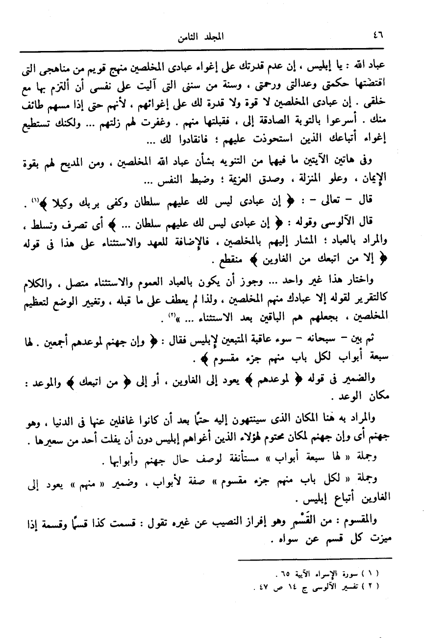عباد الله: يا إبليس، إن عدم قدرتك على إغواء عبادي المخلصين منهج قويم من مناهجى التي اقتضتها حكمتى وعدالتى ورحمتي، وسنة من سنني التي آليت على نفسي أن ألتزم بها مع خلقي. إن عبادي المخلصين لا قوة ولا قدرة لك على إغوائهم، لأنهم حتى إذا مسهم طائف منك. أسرعوا بالتوبة الصادقة إلى، فقبلتها منهم. وغفرت لهم زلتهم ... ولكنك تستطيع إغواء أتباعك الذين استحوذت عليهم فانقادوا لك ...