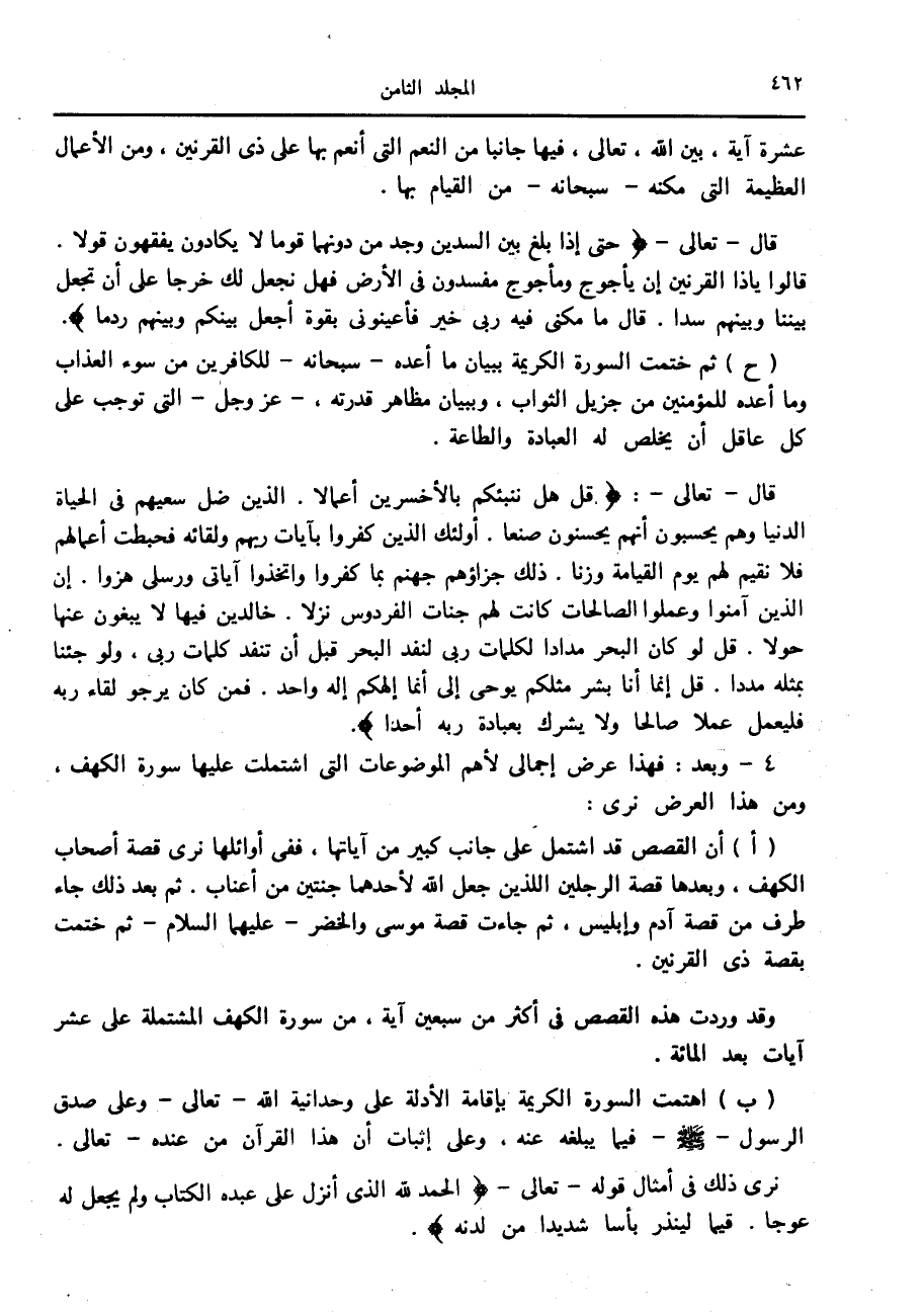4- وبعد: فهذا عرض إجمالى لأهم الموضوعات التي اشتملت عليها سورة الكهف، ومن هذا العرض نرى: