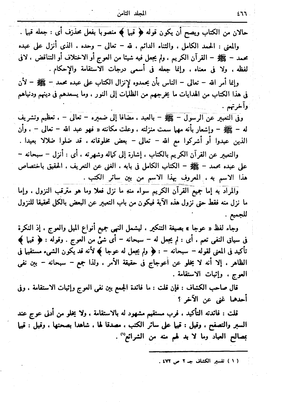 وجاء لفظ «عوجا» بصيغة التنكير، ليشمل النهى جميع أنواع الميل والعوج، إذ النكرة في سياق النفي تعم، أى: لم يجعل له- سبحانه- أى شيء من العوج. وقوله: قَيِّماً تأكيد في المعنى لقوله- سبحانه-: وَلَمْ يَجْعَلْ لَهُ عِوَجاً لأنه قد يكون الشيء مستقيما في الظاهر، إلا أنه لا يخلو عن اعوجاج في حقيقة الأمر، ولذا جمع- سبحانه- بين نفى العوج، وإثبات الاستقامة.