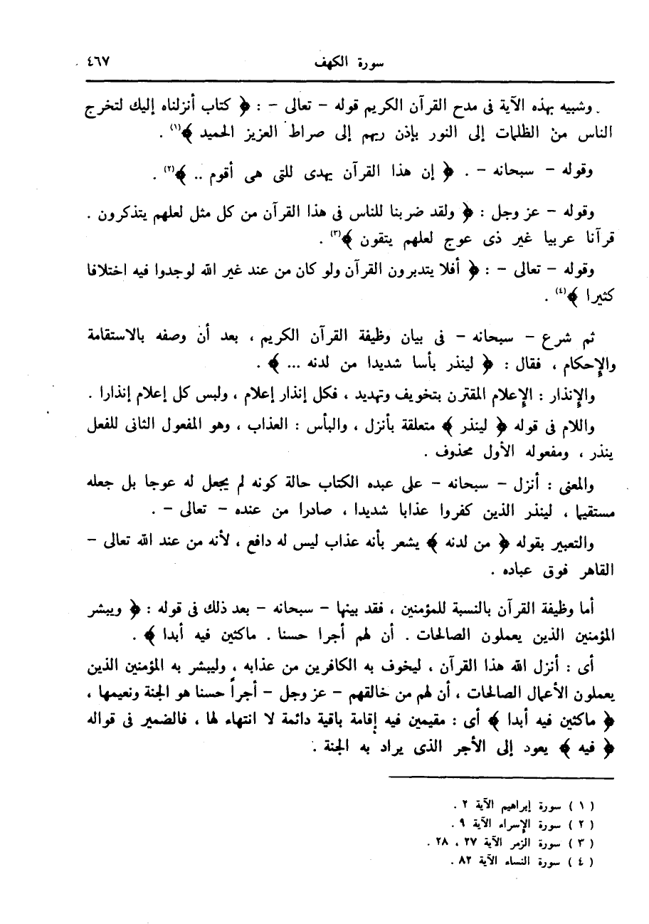 وشبيه بهذه الآية في مدح القرآن الكريم قوله- تعالى-: كِتابٌ أَنْزَلْناهُ إِلَيْكَ لِتُخْرِجَ النَّاسَ مِنَ الظُّلُماتِ إِلَى النُّورِ بِإِذْنِ رَبِّهِمْ إِلى صِراطِ الْعَزِيزِ الْحَمِيدِ «1» .