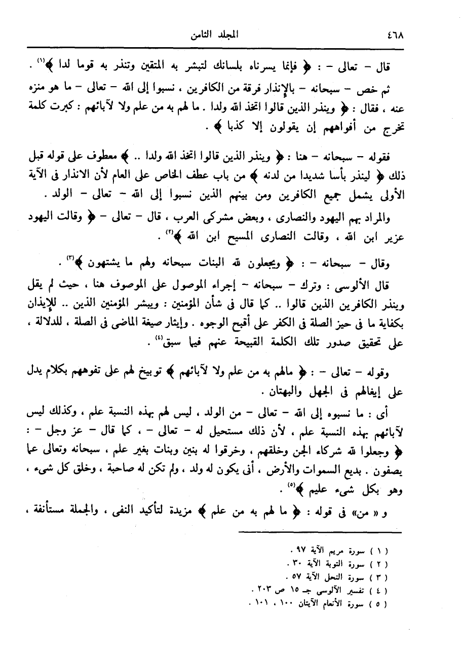 ثم خص- سبحانه- بالإنذار فرقة من الكافرين، نسبوا إلى الله- تعالى- ما هو منزه عنه، فقال: وَيُنْذِرَ الَّذِينَ قالُوا اتَّخَذَ اللَّهُ وَلَداً. ما لَهُمْ بِهِ مِنْ عِلْمٍ وَلا لِآبائِهِمْ: كَبُرَتْ كَلِمَةً تَخْرُجُ مِنْ أَفْواهِهِمْ إِنْ يَقُولُونَ إِلَّا كَذِباً.