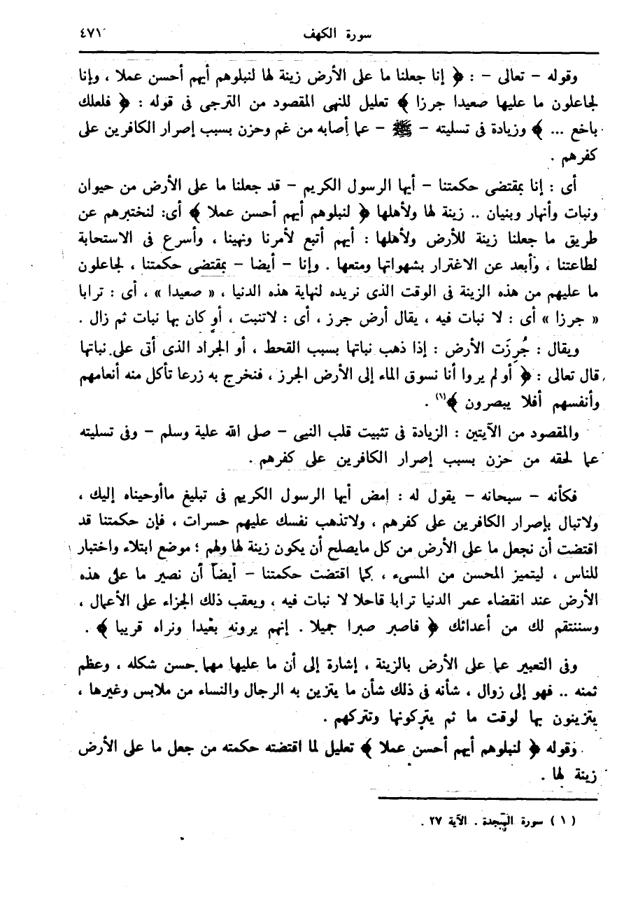 وقوله- تعالى-: إِنَّا جَعَلْنا ما عَلَى الْأَرْضِ زِينَةً لَها لِنَبْلُوَهُمْ أَيُّهُمْ أَحْسَنُ عَمَلًا، وَإِنَّا لَجاعِلُونَ ما عَلَيْها صَعِيداً جُرُزاً تعليل للنهى المقصود من الترجي في قوله: فَلَعَلَّكَ باخِعٌ ... وزيادة في تسليته صلى الله عليه وسلم عما أصابه من غم وحزن بسبب إصرار الكافرين على كفرهم.