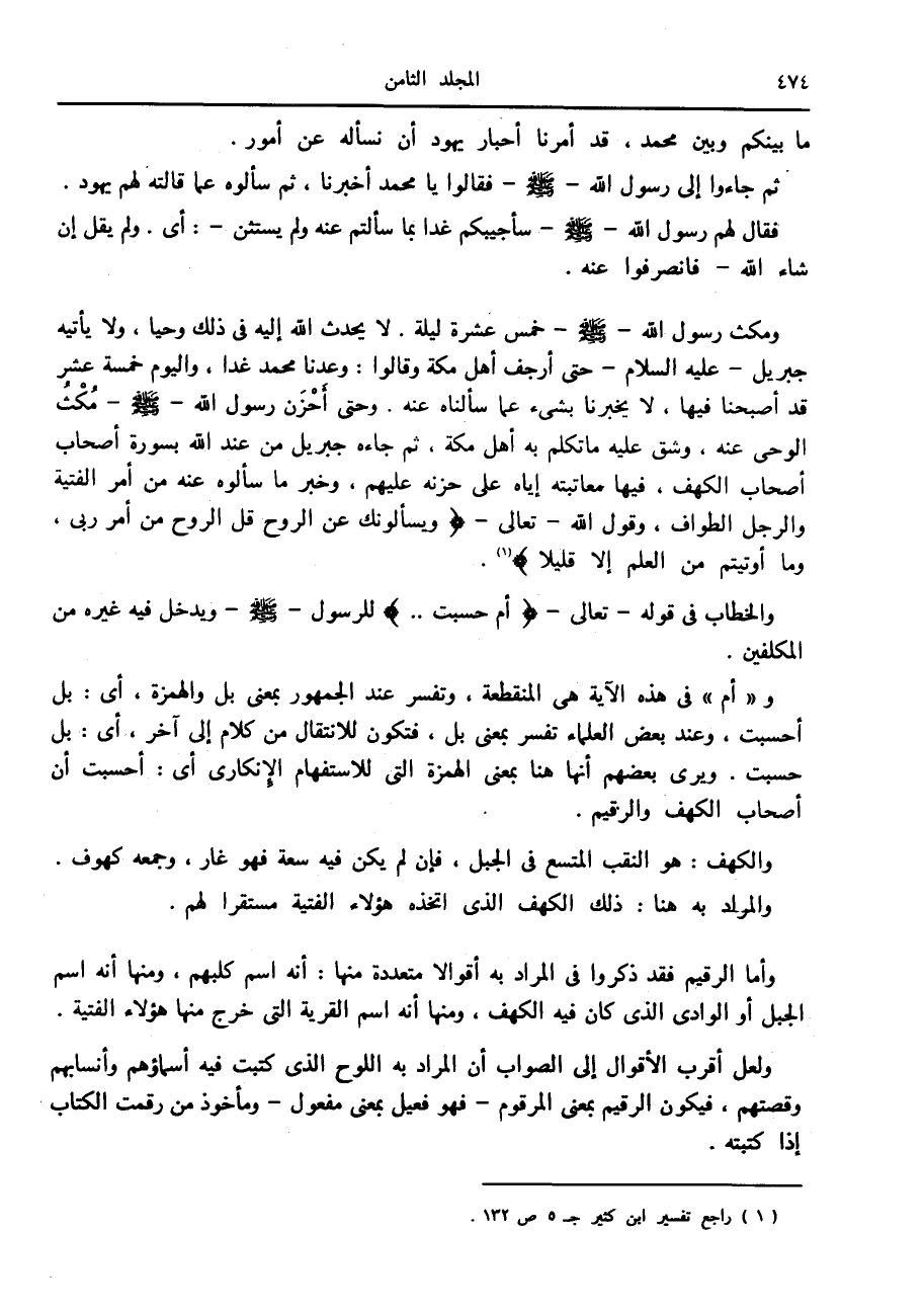 ومكث رسول الله صلى الله عليه وسلم خمس عشرة ليلة. لا يحدث الله إليه في ذلك وحيا، ولا يأتيه جبريل- عليه السلام- حتى أرجف أهل مكة وقالوا: وعدنا محمد غدا، واليوم خمسة عشر قد أصبحنا فيها، لا يخبرنا بشيء عما سألناه عنه. وحتى أحزن رسول الله صلى الله عليه وسلم مكث الوحى عنه، وشق عليه ما تكلم به أهل مكة، ثم جاءه جبريل من عند الله بسورة أصحاب أصحاب الكهف، فيها معاتبته إياه على حزنه عليهم، وخبر ما سألوه عنه من أمر الفتية والرجل الطواف، وقول الله- تعالى- وَيَسْئَلُونَكَ عَنِ الرُّوحِ قُلِ الرُّوحُ مِنْ أَمْرِ رَبِّي، وَما أُوتِيتُمْ مِنَ الْعِلْمِ إِلَّا قَلِيلًا «1» .