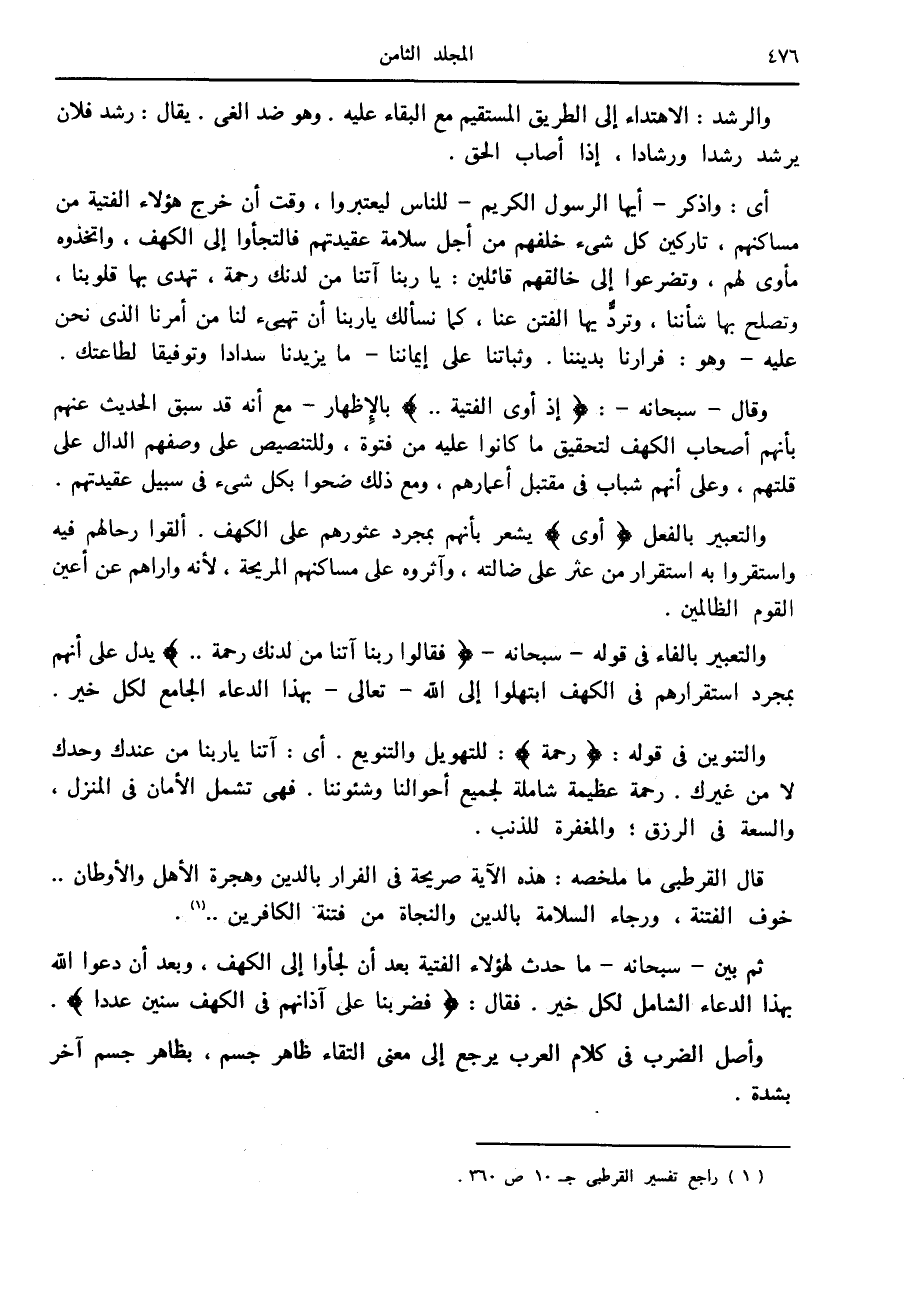 وقال- سبحانه-: إِذْ أَوَى الْفِتْيَةُ.. بالإظهار- مع أنه قد سبق الحديث عنهم بأنهم أصحاب الكهف لتحقيق ما كانوا عليه من فتوة، وللتنصيص على وصفهم الدال على قلتهم، وعلى أنهم شباب في مقتبل أعمارهم، ومع ذلك ضحوا بكل شيء في سبيل عقيدتهم.