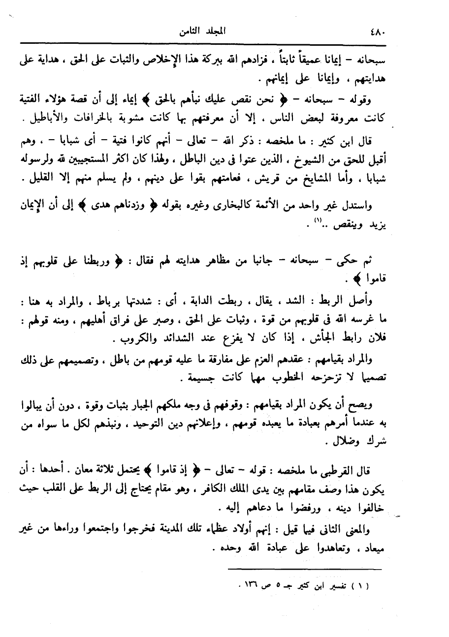 ثم حكى- سبحانه- جانبا من مظاهر هدايته لهم فقال: وَرَبَطْنا عَلى قُلُوبِهِمْ إِذْ قامُوا.