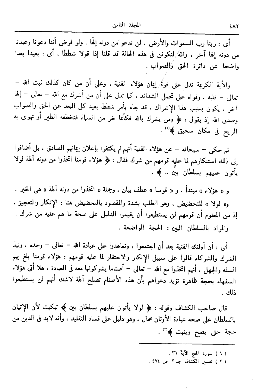 ثم حكى- سبحانه- عن هؤلاء الفتية أنهم لم يكتفوا بإعلان إيمانهم الصادق، بل أضافوا إلى ذلك استنكارهم لما عليه قومهم من شرك فقال: هؤُلاءِ قَوْمُنَا اتَّخَذُوا مِنْ دُونِهِ آلِهَةً لَوْلا يَأْتُونَ عَلَيْهِمْ بِسُلْطانٍ بَيِّنٍ ...