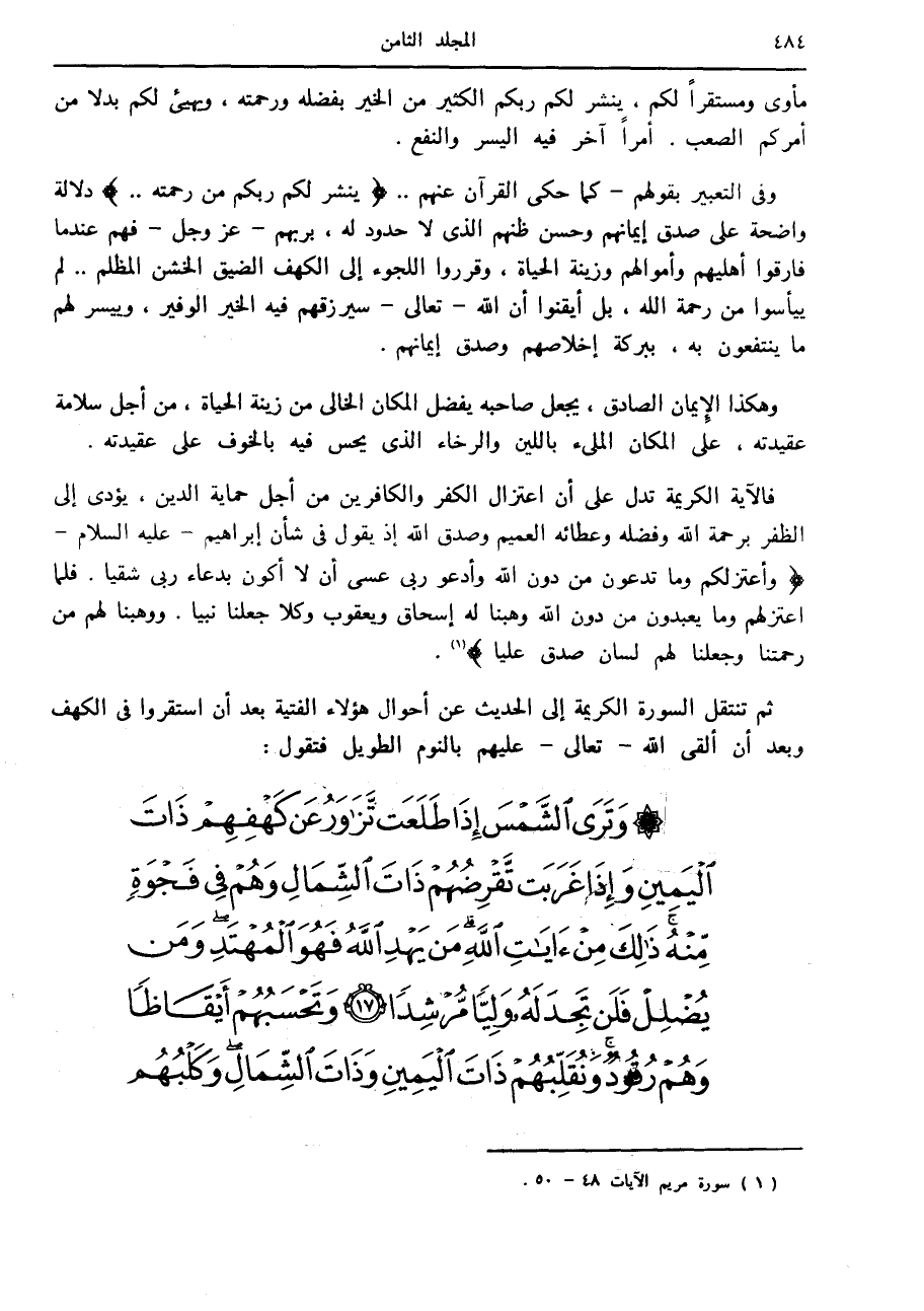 فالآية الكريمة تدل على أن اعتزال الكفر والكافرين من أجل حماية الدين، يؤدى إلى الظفر برحمة الله وفضله وعطائه العميم وصدق الله إذ يقول في شأن إبراهيم- عليه السلام- وَأَعْتَزِلُكُمْ وَما تَدْعُونَ مِنْ دُونِ اللَّهِ وَأَدْعُوا رَبِّي عَسى أَلَّا أَكُونَ بِدُعاءِ رَبِّي شَقِيًّا. فَلَمَّا اعْتَزَلَهُمْ وَما يَعْبُدُونَ مِنْ دُونِ اللَّهِ وَهَبْنا لَهُ إِسْحاقَ وَيَعْقُوبَ وَكُلًّا جَعَلْنا نَبِيًّا. وَوَهَبْنا لَهُمْ مِنْ رَحْمَتِنا وَجَعَلْنا لَهُمْ لِسانَ صِدْقٍ عَلِيًّا «1» .