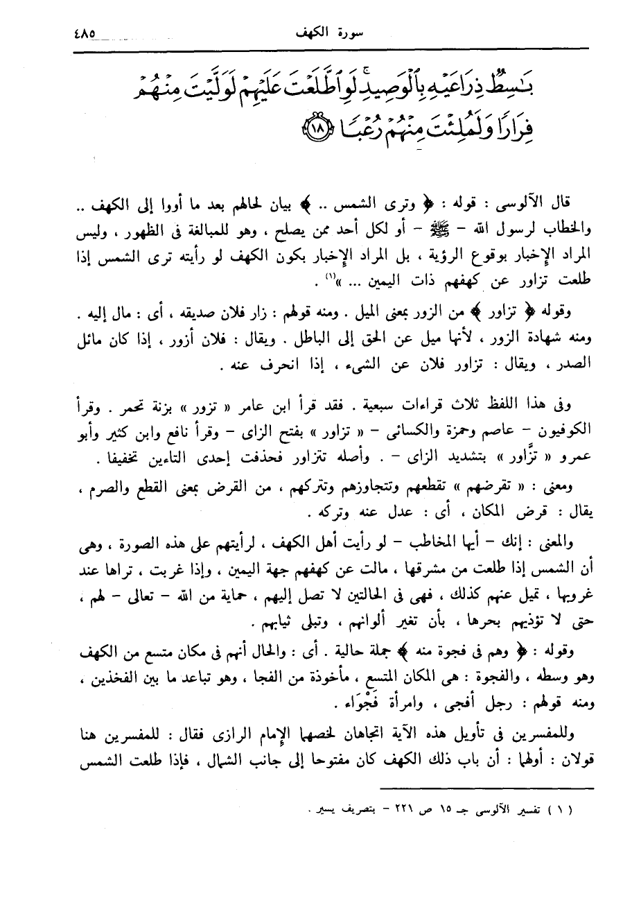 وللمفسرين في تأويل هذه الآية اتجاهان لخصهما الإمام الرازي فقال: للمفسرين هنا قولان: أولهما: أن باب ذلك الكهف كان مفتوحا إلى جانب الشمال، فإذا طلعت الشمس