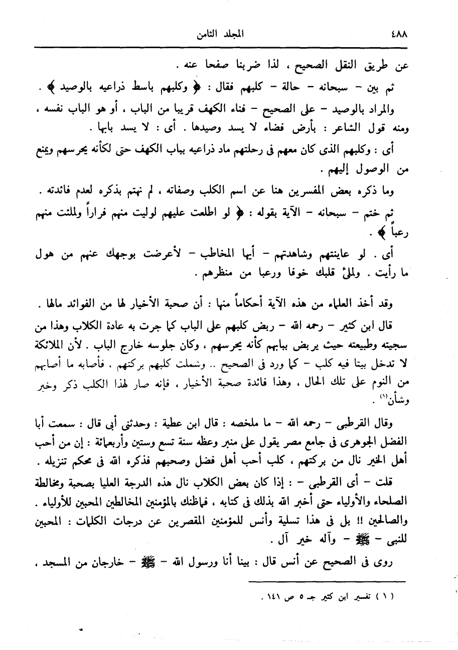 قلت- أى القرطبي-: إذا كان بعض الكلاب نال هذه الدرجة العليا بصحبة ومخالطة الصلحاء والأولياء حتى أخبر الله بذلك في كتابه، فما ظنك بالمؤمنين المخالطين المحبين للأولياء.