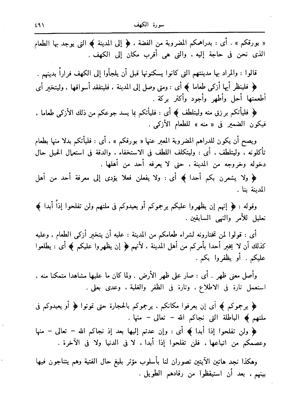 ويصح أن يكون للدراهم المضروبة المعبر عنها «بورقكم» ، أى: فليأتكم بدلا منها بطعام تأكلونه، وليتلطف، أى: وليتكلف اللطف في الاستخفاء، والدقة في استعمال الحيل حال دخوله وخروجه من المدينة، حتى لا يعرفه أحد من أهلها.