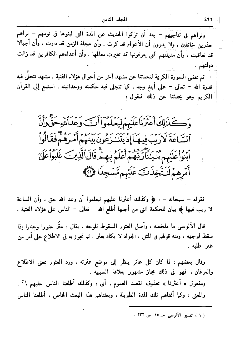 وَكَذلِكَ أَعْثَرْنا عَلَيْهِمْ لِيَعْلَمُوا أَنَّ وَعْدَ اللَّهِ حَقٌّ وَأَنَّ السَّاعَةَ لا رَيْبَ فِيها إِذْ يَتَنازَعُونَ بَيْنَهُمْ أَمْرَهُمْ فَقالُوا ابْنُوا عَلَيْهِمْ بُنْياناً رَبُّهُمْ أَعْلَمُ بِهِمْ قالَ الَّذِينَ غَلَبُوا عَلى أَمْرِهِمْ لَنَتَّخِذَنَّ عَلَيْهِمْ مَسْجِداً (21)