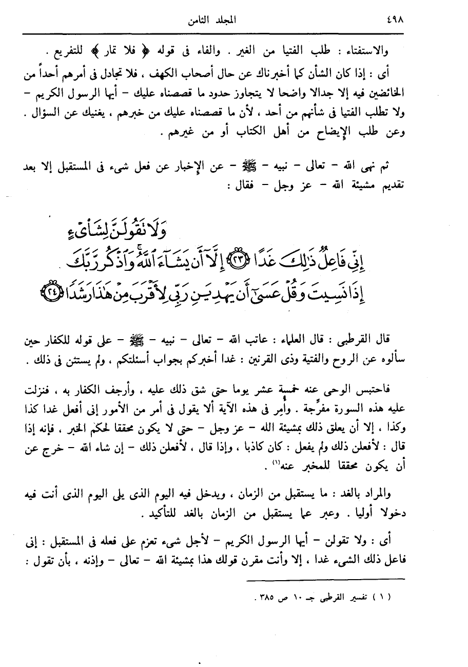 قال القرطبي: قال العلماء: عاتب الله- تعالى- نبيه صلى الله عليه وسلم على قوله للكفار حين سألوه عن الروح والفتية وذي القرنين: غدا أخبركم بجواب أسئلتكم، ولم يستثن في ذلك.