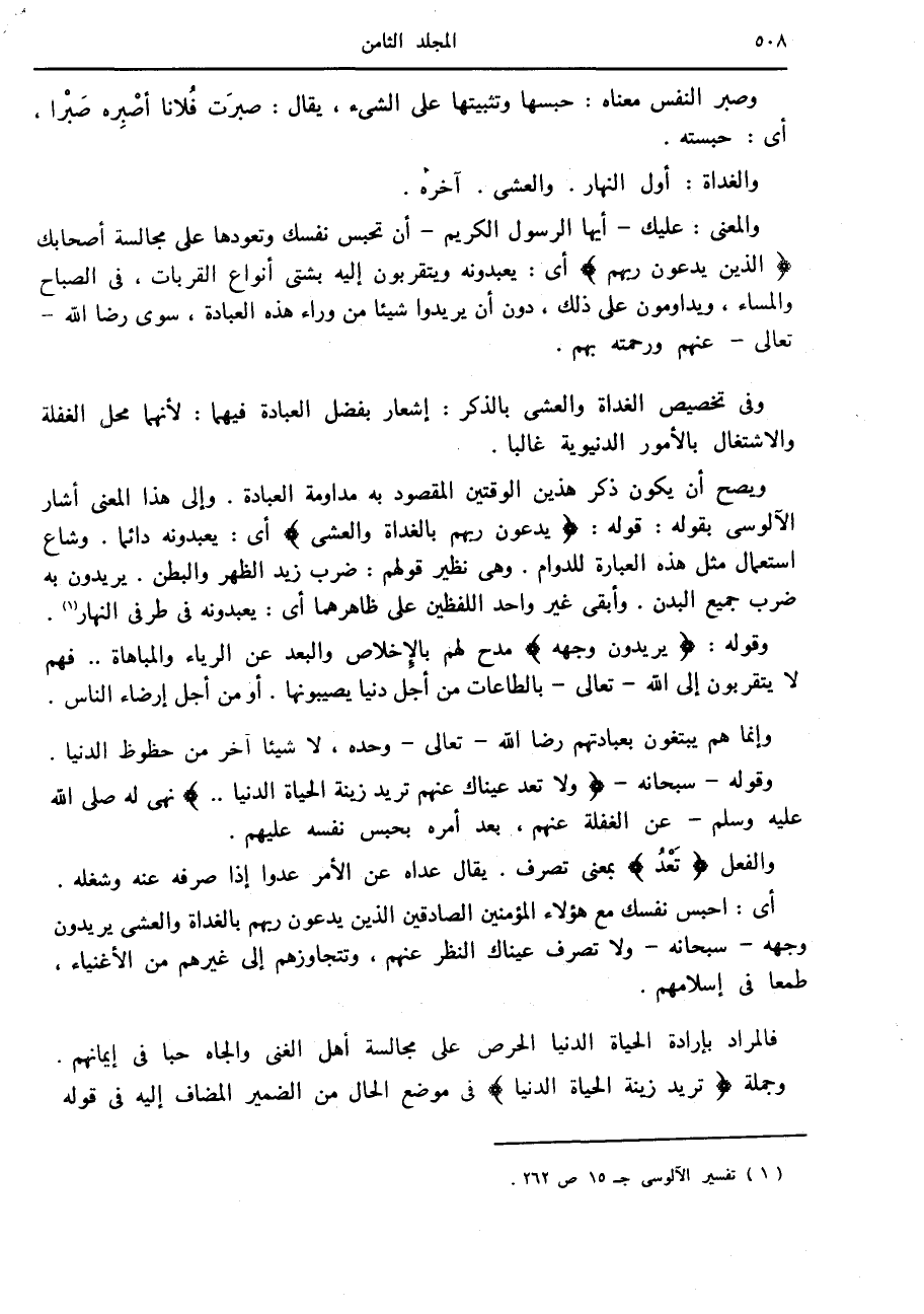 ويصح أن يكون ذكر هذين الوقتين المقصود به مداومة العبادة. وإلى هذا المعنى أشار الآلوسى بقوله: قوله: يَدْعُونَ رَبَّهُمْ بِالْغَداةِ وَالْعَشِيِّ أى: يعبدونه دائما. وشاع استعمال مثل هذه العبارة للدوام. وهي نظير قولهم: ضرب زيد الظهر والبطن. يريدون به ضرب جميع البدن. وأبقى غير واحد اللفظين على ظاهرهما أى: يعبدونه في طرفي النهار «1» .