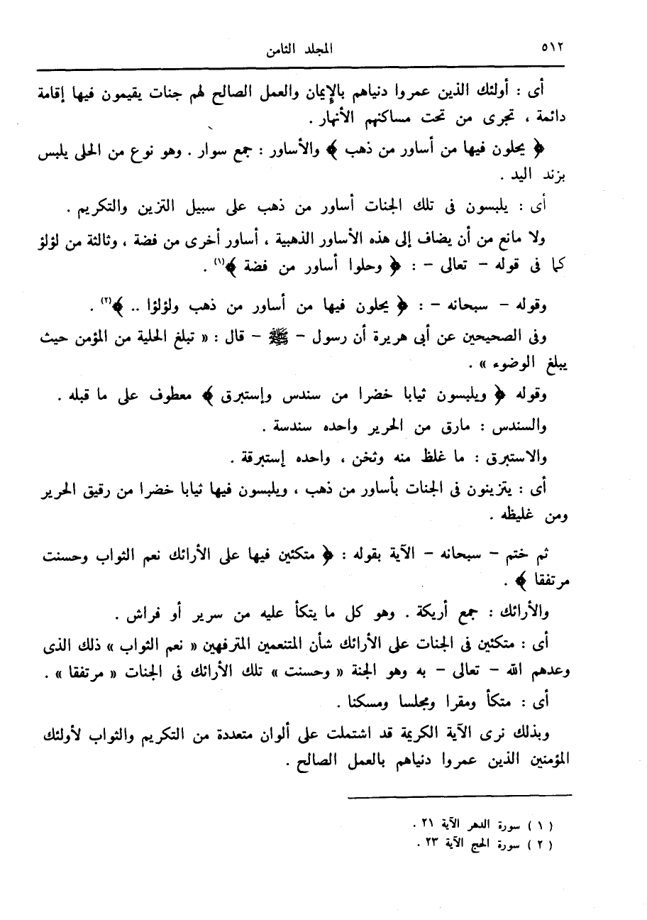 وقوله- سبحانه-: يُحَلَّوْنَ فِيها مِنْ أَساوِرَ مِنْ ذَهَبٍ وَلُؤْلُؤاً.. «2» .