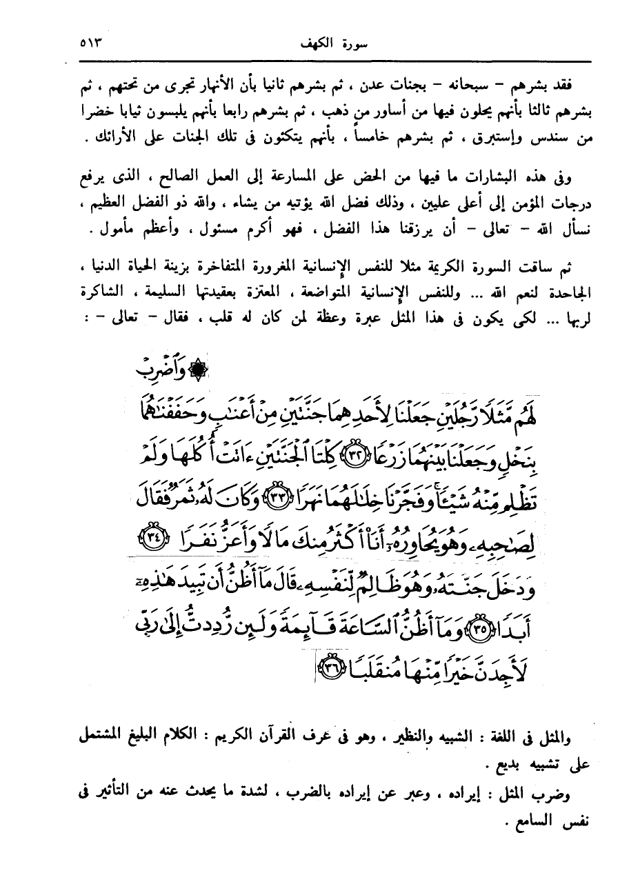 وَاضْرِبْ لَهُمْ مَثَلاً رَجُلَيْنِ جَعَلْنا لِأَحَدِهِما جَنَّتَيْنِ مِنْ أَعْنابٍ وَحَفَفْناهُما بِنَخْلٍ وَجَعَلْنا بَيْنَهُما زَرْعاً (32) كِلْتَا الْجَنَّتَيْنِ آتَتْ أُكُلَها وَلَمْ تَظْلِمْ مِنْهُ شَيْئاً وَفَجَّرْنا خِلالَهُما نَهَراً (33) وَكانَ لَهُ ثَمَرٌ فَقالَ لِصاحِبِهِ وَهُوَ يُحاوِرُهُ أَنَا أَكْثَرُ مِنْكَ مالاً وَأَعَزُّ نَفَراً (34) وَدَخَلَ جَنَّتَهُ وَهُوَ ظالِمٌ لِنَفْسِهِ قالَ ما أَظُنُّ أَنْ تَبِيدَ هذِهِ أَبَداً (35) وَما أَظُنُّ السَّاعَةَ قائِمَةً وَلَئِنْ رُدِدْتُ إِلى رَبِّي لَأَجِدَنَّ خَيْراً مِنْها مُنْقَلَباً (36)
