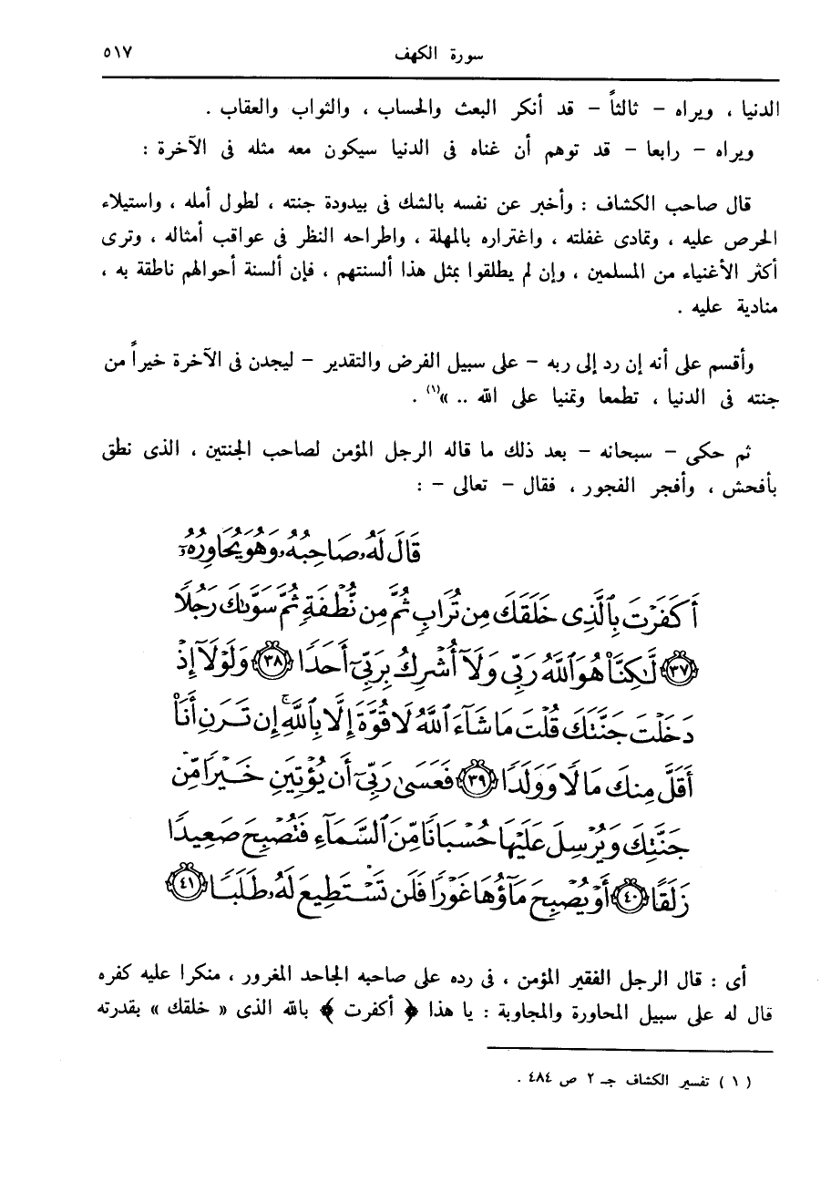 قالَ لَهُ صاحِبُهُ وَهُوَ يُحاوِرُهُ أَكَفَرْتَ بِالَّذِي خَلَقَكَ مِنْ تُرابٍ ثُمَّ مِنْ نُطْفَةٍ ثُمَّ سَوَّاكَ رَجُلاً (37) لكِنَّا هُوَ اللَّهُ رَبِّي وَلا أُشْرِكُ بِرَبِّي أَحَداً (38) وَلَوْلا إِذْ دَخَلْتَ جَنَّتَكَ قُلْتَ ما شاءَ اللَّهُ لا قُوَّةَ إِلاَّ بِاللَّهِ إِنْ تَرَنِ أَنَا أَقَلَّ مِنْكَ مالاً وَوَلَداً (39) فَعَسى رَبِّي أَنْ يُؤْتِيَنِ خَيْراً مِنْ جَنَّتِكَ وَيُرْسِلَ عَلَيْها حُسْباناً مِنَ السَّماءِ فَتُصْبِحَ صَعِيداً زَلَقاً (40) أَوْ يُصْبِحَ ماؤُها غَوْراً فَلَنْ تَسْتَطِيعَ لَهُ طَلَباً (41)