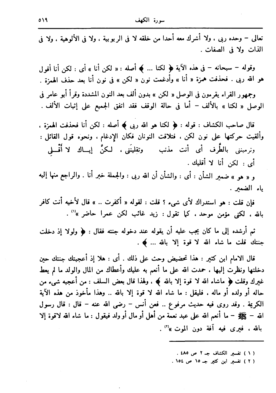 قال صاحب الكشاف: قوله: لكِنَّا هُوَ اللَّهُ رَبِّي أصله: لكن أنا فحذفت الهمزة، وألقيت حركتها على نون لكن، فتلاقت النونان فكان الإدغام، ونحوه قول القائل: