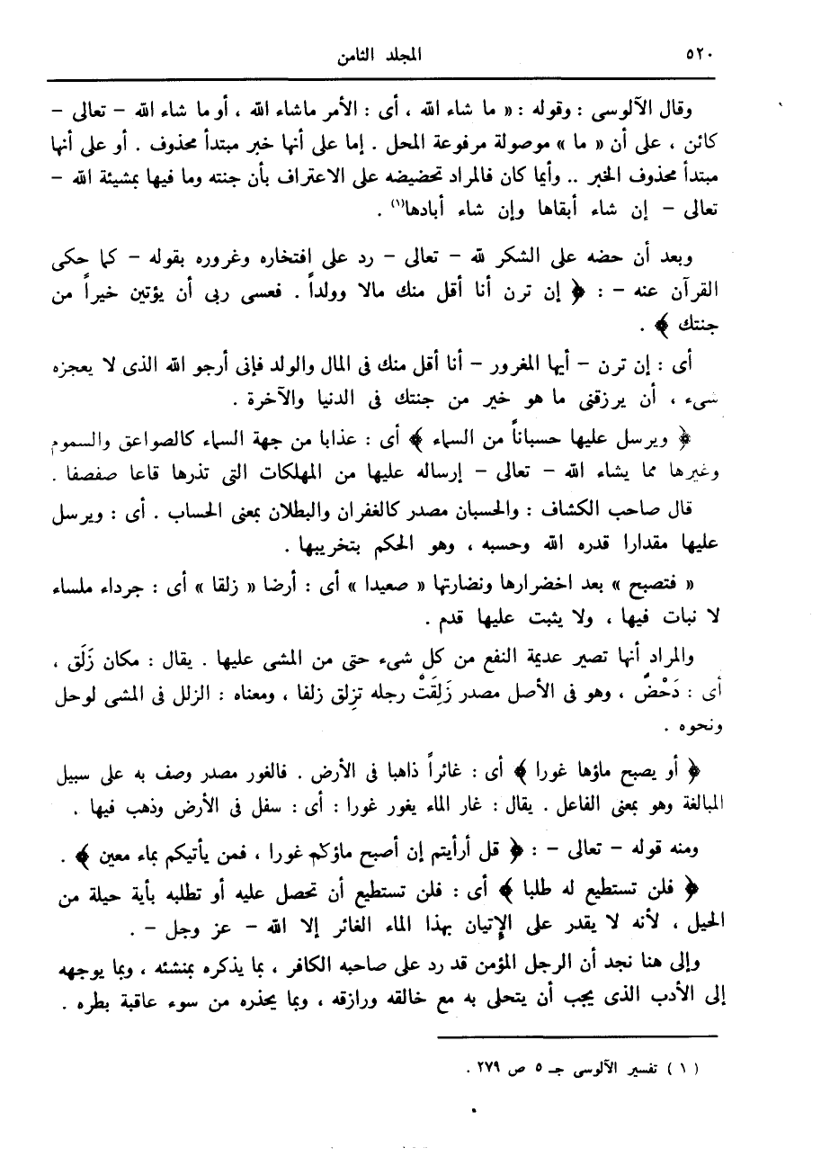 وقال الآلوسى: وقوله: «ما شاء الله، أى: الأمر ما شاء الله، أو ما شاء الله- تعالى- كائن، على أن «ما» موصولة مرفوعة المحل. إما على أنها خبر مبتدأ محذوف. أو على أنها مبتدأ محذوف الخبر.. وأيما كان فالمراد تحضيضه على الاعتراف بأن جنته وما فيها بمشيئة الله- تعالى- إن شاء أبقاها وإن شاء أبادها «1» .