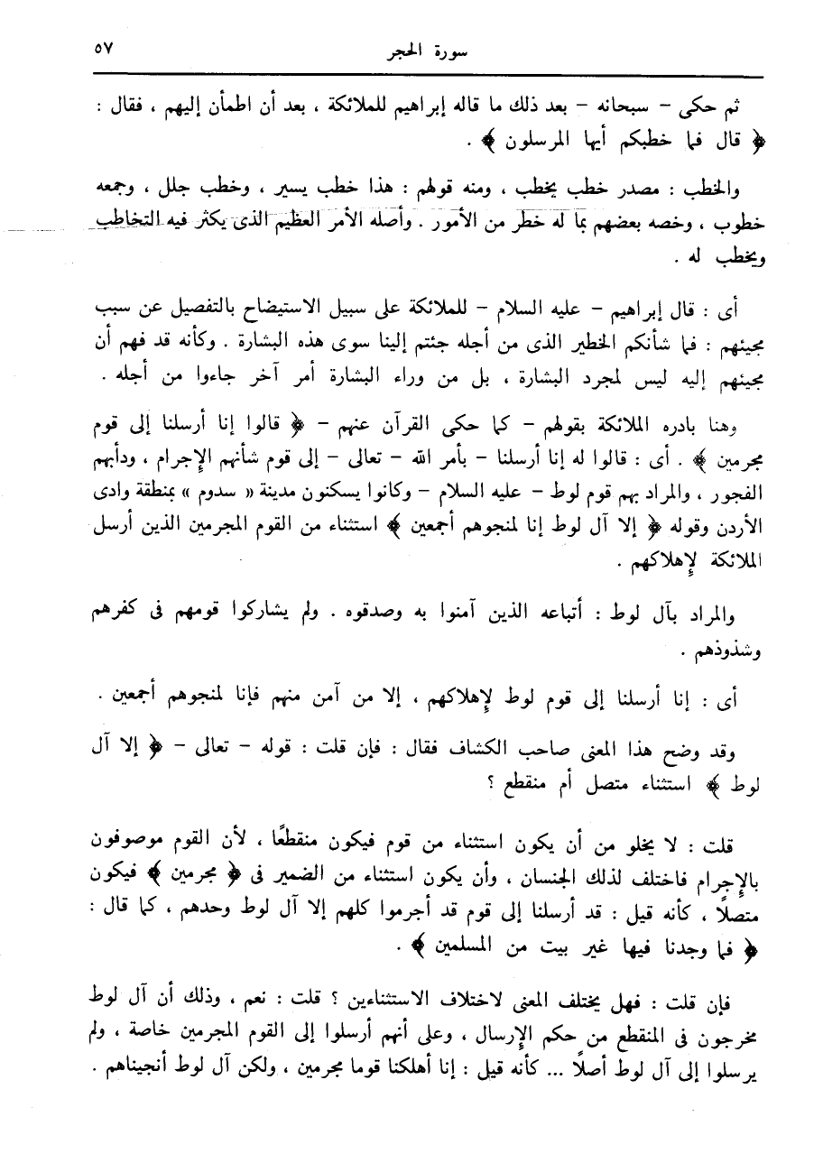 وهنا بادره الملائكة بقولهم- كما حكى القرآن عنهم- قالُوا إِنَّا أُرْسِلْنا إِلى قَوْمٍ مُجْرِمِينَ. أى: قالوا له إنا أرسلنا- بأمر الله- تعالى- إلى قوم شأنهم الإجرام، ودأبهم الفجور، والمراد بهم قوم لوط- عليه السلام- وكانوا يسكنون مدينة «سدوم» بمنطقة وادي الأردن وقوله إِلَّا آلَ لُوطٍ إِنَّا لَمُنَجُّوهُمْ أَجْمَعِينَ استثناء من القوم المجرمين الذين أرسل الملائكة لإهلاكهم.