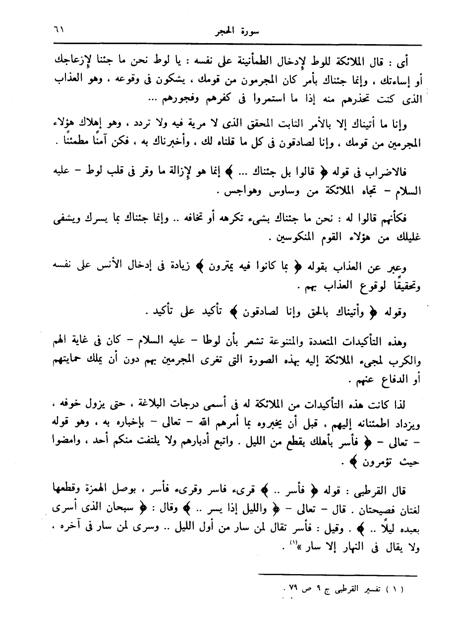 لذا كانت هذه التأكيدات من الملائكة له في أسمى درجات البلاغة، حتى يزول خوفه، ويزداد اطمئنانه إليهم، قبل أن يخبروه بما أمرهم الله- تعالى- بإخباره به، وهو قوله- تعالى- فَأَسْرِ بِأَهْلِكَ بِقِطْعٍ مِنَ اللَّيْلِ. وَاتَّبِعْ أَدْبارَهُمْ وَلا يَلْتَفِتْ مِنْكُمْ أَحَدٌ، وَامْضُوا حَيْثُ تُؤْمَرُونَ.