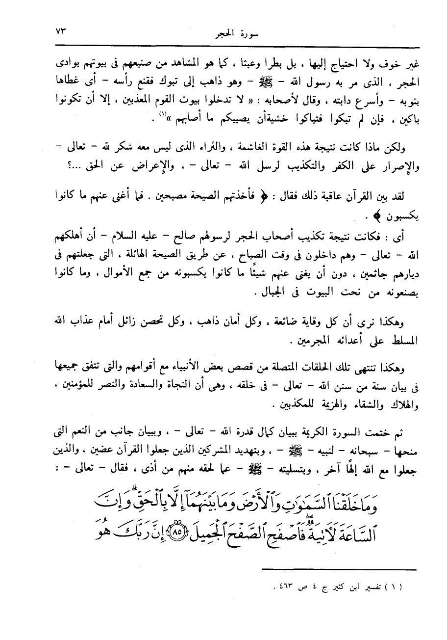 غير خوف ولا احتياج إليها، بل بطرا وعبثا، كما هو المشاهد من صنيعهم في بيوتهم بوادي الحجر، الذي مر به رسول الله صلى الله عليه وسلم وهو ذاهب إلى تبوك فقنع رأسه- أى غطاها بثوبه- وأسرع دابته، وقال لأصحابه: «لا تدخلوا بيوت القوم المعذبين، إلا أن تكونوا باكين، فإن لم تبكوا فتباكوا خشية أن يصيبكم ما أصابهم» «1» .