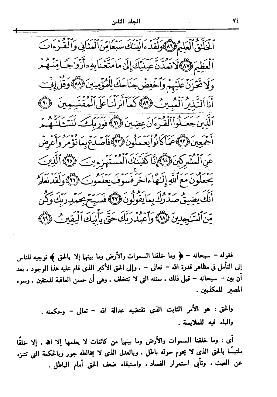 فقوله- سبحانه- وَما خَلَقْنَا السَّماواتِ وَالْأَرْضَ وَما بَيْنَهُما إِلَّا بِالْحَقِّ توجيه للناس إلى التأمل في مظاهر قدرة الله- تعالى-، وإلى الحق الأكبر الذي قام عليه هذا الوجود، بعد أن بين- سبحانه- قبل ذلك، سنته التي لا تتخلف، وهي أن حسن العاقبة للمتقين، وسوء المصير للمكذبين.