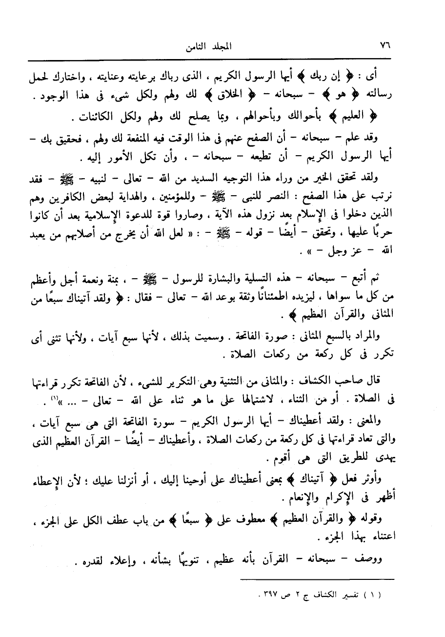 قال صاحب الكشاف: والمثاني من التثنية وهي التكرير للشيء، لأن الفاتحة تكرر قراءتها في الصلاة. أو من الثناء، لاشتمالها على ما هو ثناء على الله- تعالى- ... » «1» .