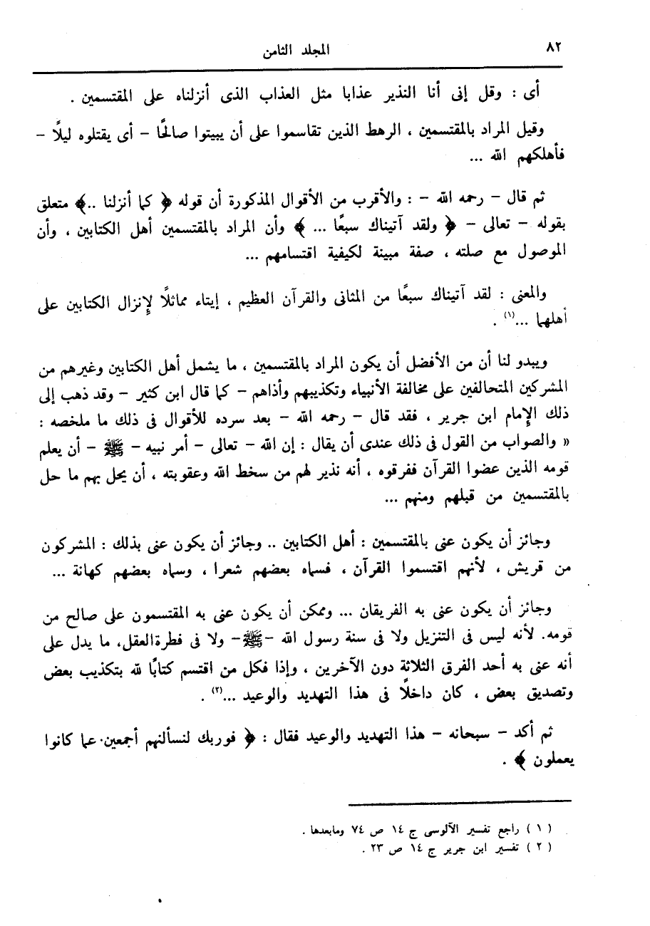 ويبدو لنا أن من الأفضل أن يكون المراد بالمقتسمين، ما يشمل أهل الكتابين وغيرهم من المشركين المتحالفين على مخالفة الأنبياء وتكذيبهم وأذاهم- كما قال ابن كثير- وقد ذهب إلى ذلك الإمام ابن جرير، فقد قال- رحمه الله- بعد سرده للأقوال في ذلك ما ملخصه: