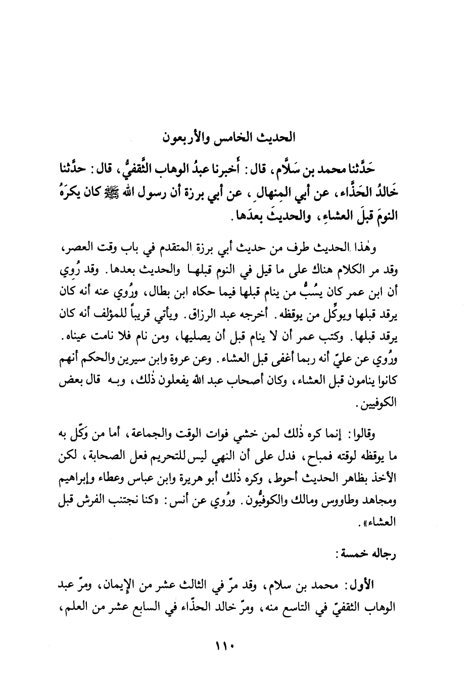 حَدَّثَنَا مُحَمَّدُ بْنُ سَلاَمٍ، قَالَ: أَخْبَرَنَا عَبْدُ الْوَهَّابِ الثَّقَفِيُّ، قَالَ: حَدَّثَنَا خَالِدٌ الْحَذَّاءُ، عَنْ أَبِي الْمِنْهَالِ، عَنْ أَبِي بَرْزَةَ أَنَّ رَسُولَ اللَّهِ -صلى الله عليه وسلم- كَانَ يَكْرَهُ النَّوْمَ قَبْلَ الْعِشَاءِ، وَالْحَدِيثَ بَعْدَهَا.
