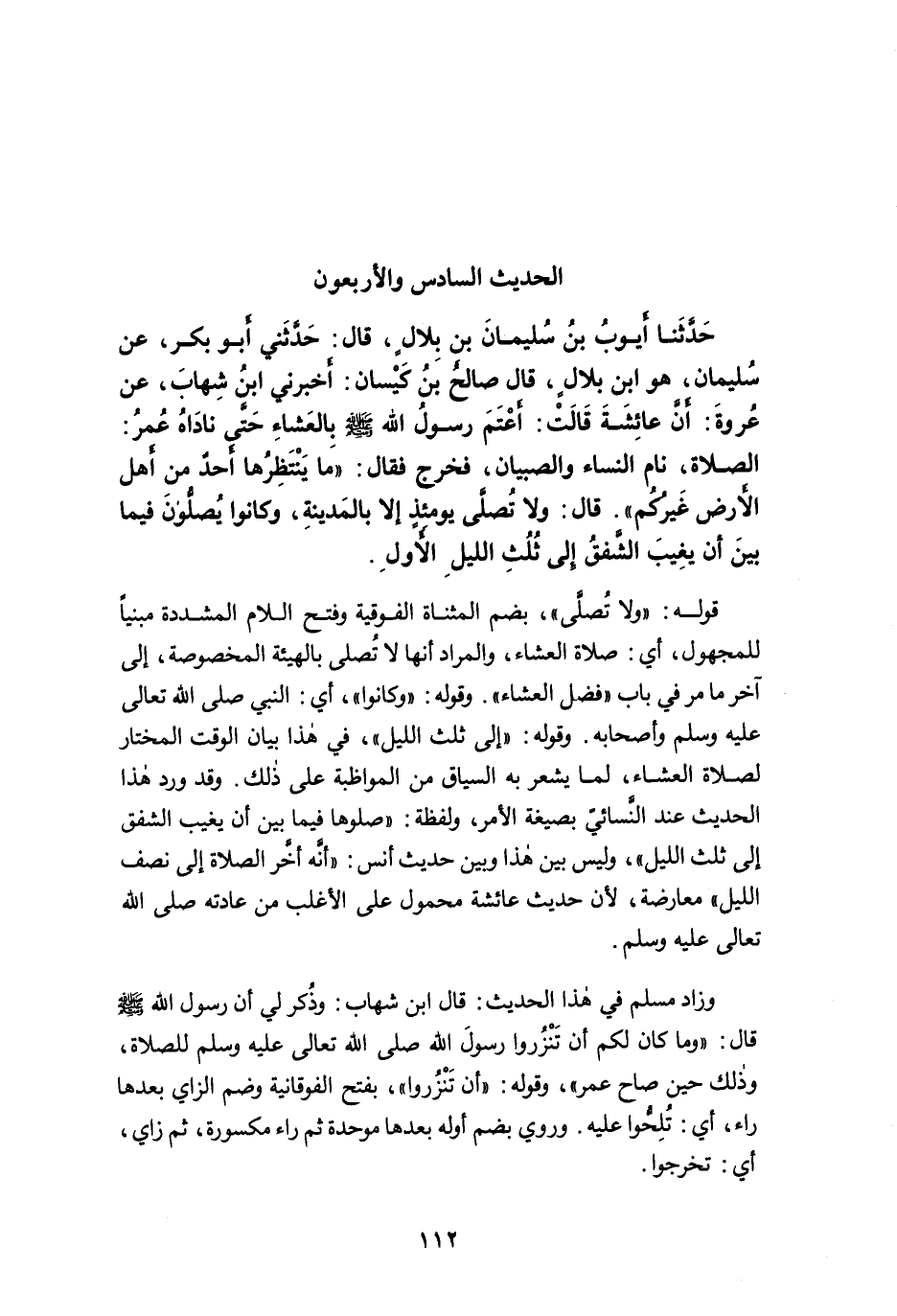 حَدَّثَنَا أَيُّوبُ بْنُ سُلَيْمَانَ بن بلالٍ، قَالَ: حَدَّثَنِي أَبُو بَكْرٍ، عَنْ سُلَيْمَانَ، هو ابن بلالٍ، قَالَ صَالِحُ بْنُ كَيْسَانَ: أَخْبَرَنِي ابْنُ شِهَابٍ، عَنْ عُرْوَةَ: أَنَّ عَائِشَةَ قَالَتْ: أَعْتَمَ رَسُولُ اللَّهِ -صلى الله عليه وسلم- بِالْعِشَاءِ حَتَّى نَادَاهُ عُمَرُ: الصَّلاَةَ، نَامَ النِّسَاءُ وَالصِّبْيَانُ. فَخَرَجَ فَقَالَ: "مَا يَنْتَظِرُهَا أَحَدٌ مِنْ أَهْلِ الأَرْضِ غَيْرُكُمْ". قَالَ: وَلاَ تُصَلَّى يَوْمَئِذٍ إِلاَّ بِالْمَدِينَةِ، وَكَانُوا يُصَلُّونَ فِيمَا بَيْنَ أَنْ يَغِيبَ الشَّفَقُ إِلَى ثُلُثِ اللَّيْلِ الأَوَّلِ.