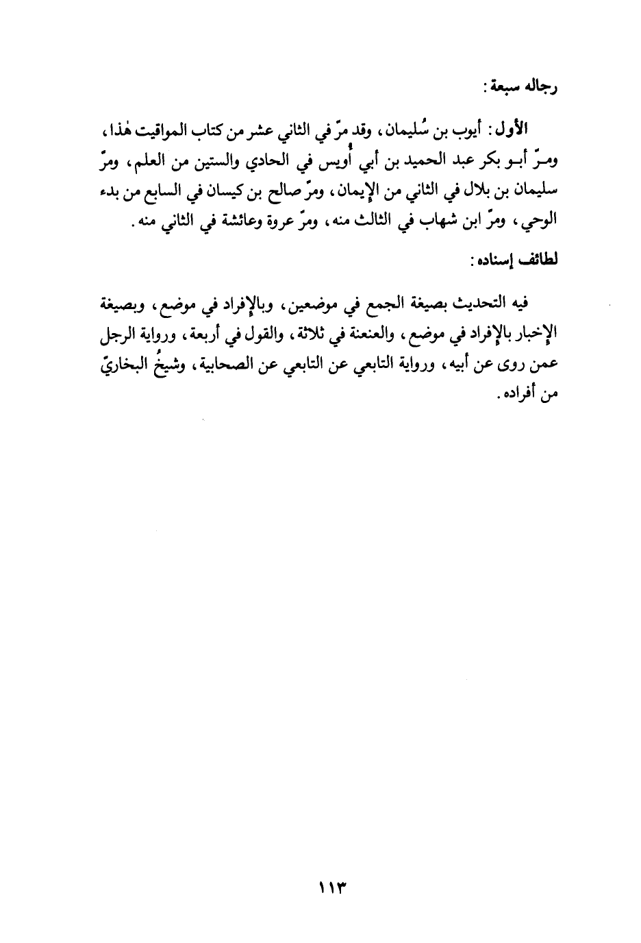 الأول: أيوب بن سُليمان، وقد مرّ في الثاني عشر من كتاب المواقيت هذا، ومرّ أبو بكر عبد الحميد بن أبي أُويس في الحادي والستين من العلم، ومرّ سليمان بن بلال في الثاني من الإيمان، ومرّ صالح بن كيسان في السابع من بدء الوحي، ومرّ ابن شهاب في الثالث منه، ومرّ عروة وعائشة في الثاني منه.