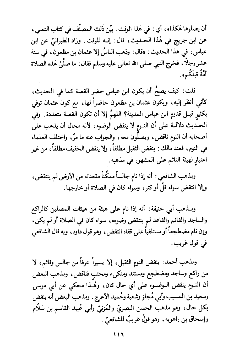 ومذهب أحمد: ينقض النوم الثقيل، إلا يسيرًا عرفًا من جالس وقائم، لا من راكع وساجد ومضطجع ومستند ومتكىء ومحتبٍ فناقض، ومذهب البعض أن النوم ينقض الوضوء على أي حال كان، وهذا محكي عن أبي موسى وسعيد بن المسيب وأبي مُجلز وشعبة وحُميد الأعرج. ومذهب البعض أنه ينقض بكل حال، وهو مذهب الحسن البصريّ والمُزنيّ وأبي عُبيد القاسم بن سَلاّم وإسحاق بن راهويه، وهو قولٌ غريبٌ للشافعيّ.