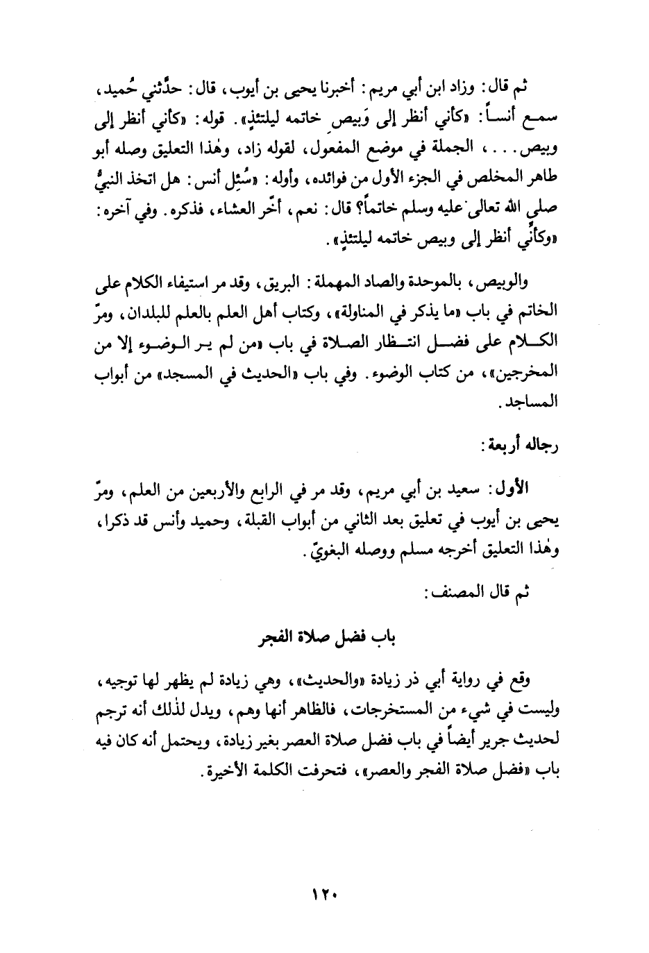الأول: سعيد بن أبي مريم، وقد مرَّ في الرابع والأربعين من العلم، ومرّ يحيى بن أيوب في تعليق بعد الثاني من أبواب القبلة، وحميد وأنس قد ذكرا، وهذا التعليق أخرجه مسلم ووصله البغويّ.
