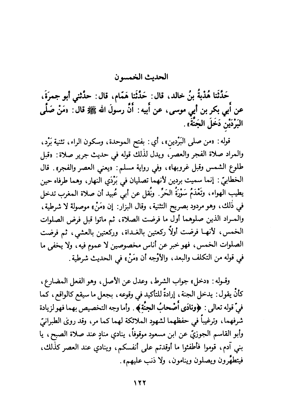 حَدَّثَنَا هُدْبَةُ بْنُ خَالِدٍ، قَالَ: حَدَّثَنَا هَمَّامٌ، قَالَ: حَدَّثَنِى أَبُو جَمْرَةَ، عَنْ أَبِي بَكْرِ بْنِ أَبِي مُوسَى، عَنْ أَبِيهِ أَنَّ رَسُولَ اللَّهِ -صلى الله عليه وسلم- قَالَ: "مَنْ صَلَّى الْبَرْدَيْنِ دَخَلَ الْجَنَّةَ".